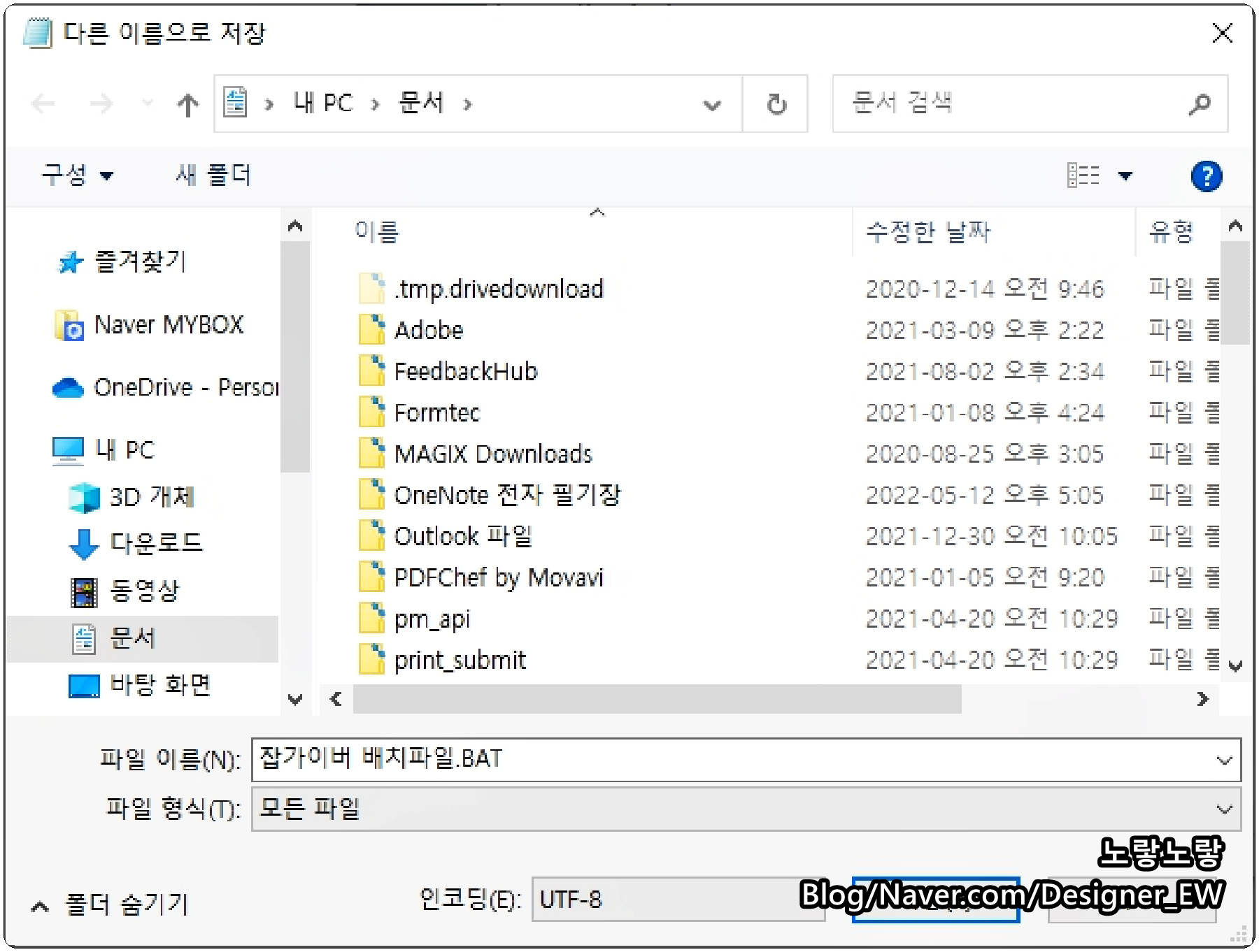 이후 다른이름으로 저장을 눌러 파일형식을 모든파일로 변경 후 파일이름 뒤에 .bat 해서 저장합니다.