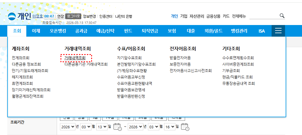 로그인 후에는 보통 조회, 계좌조회, 거래내역조회 같은 메뉴로 들어가면 됩니다.