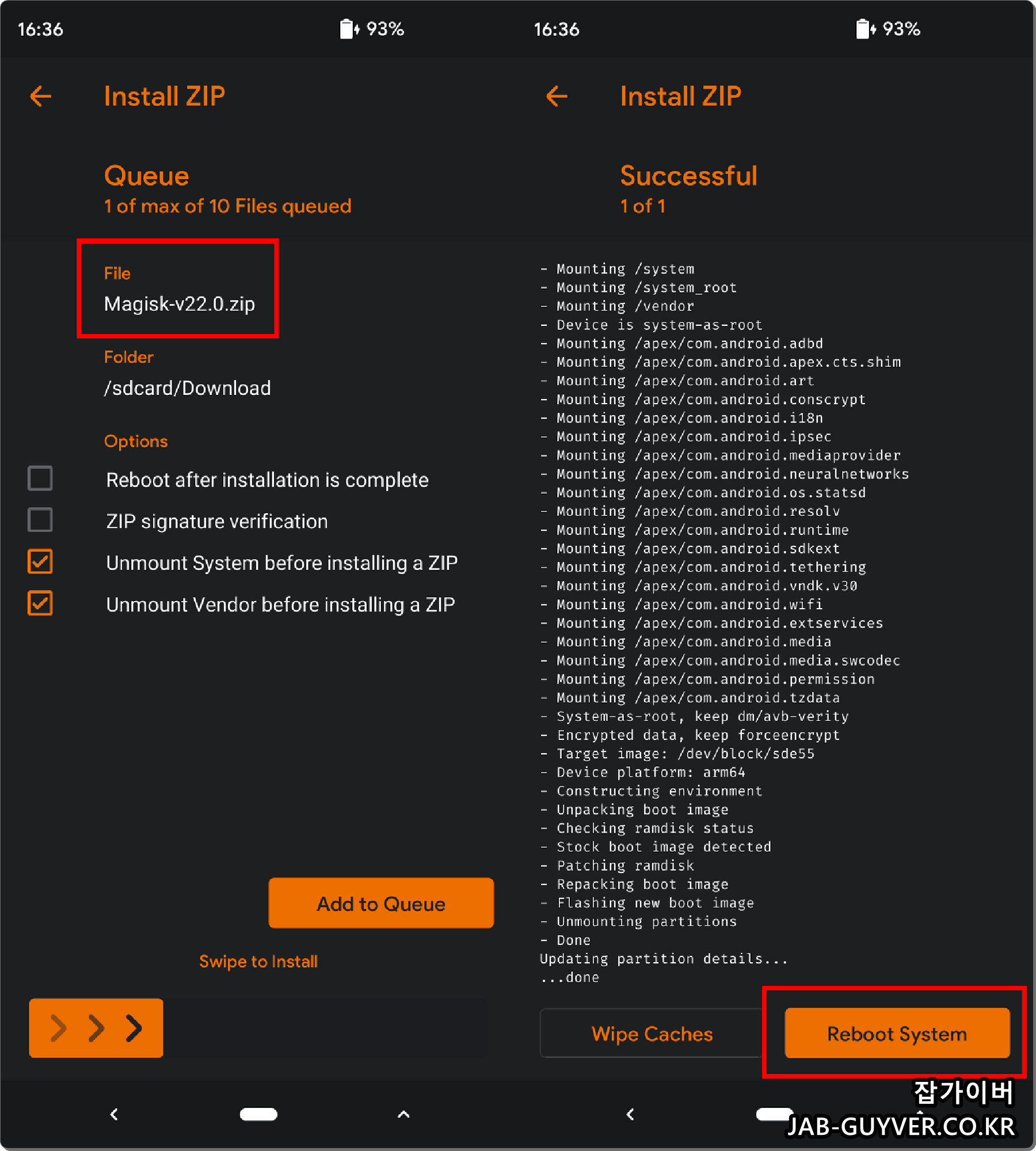 커스텀 리버버리 모드에서 Magisk.zip파일을 설치하고 재부팅합니다.