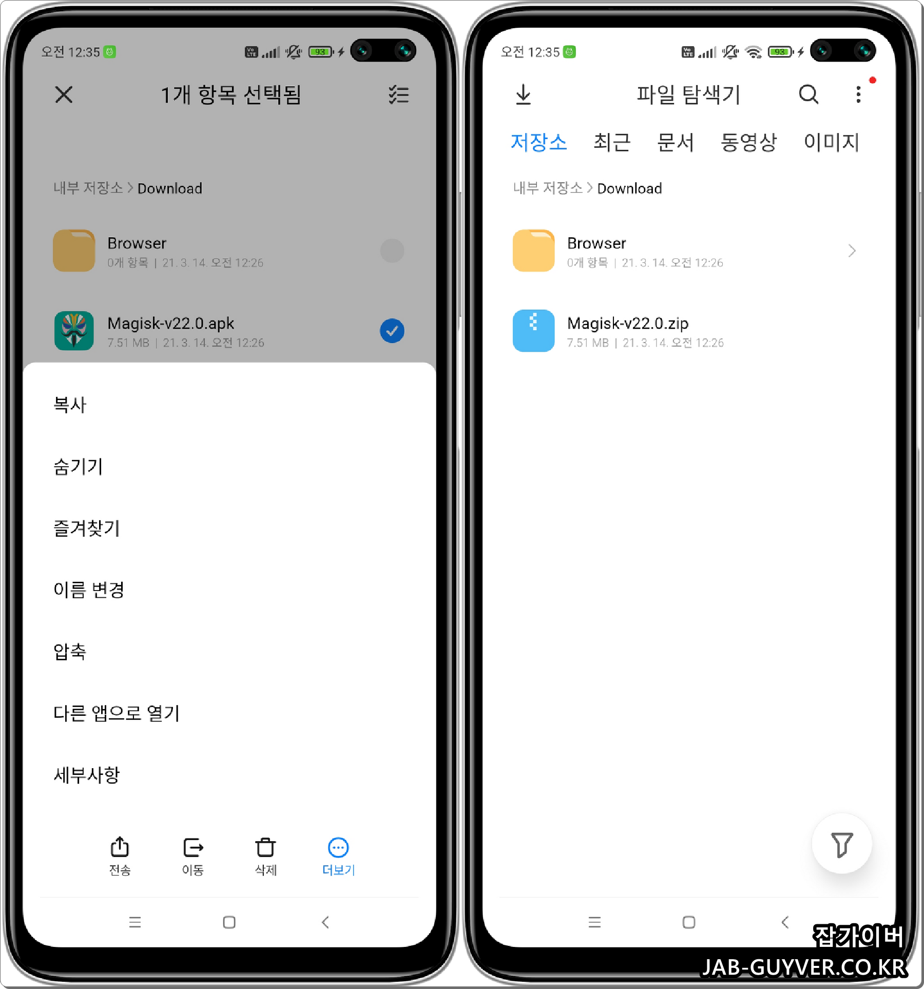 설치가 완료되었다면 파일확장자를 ZIP로 변경하고 다음 핸드폰을 리커버리 모드로 재부팅합니다.