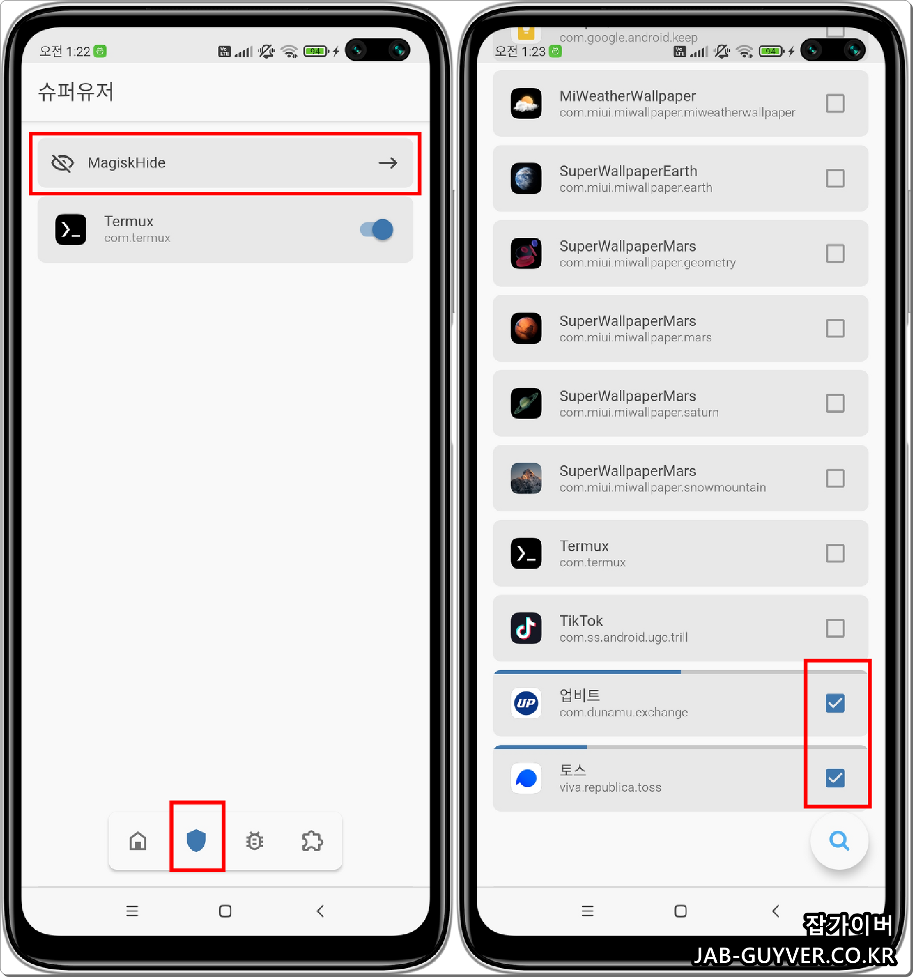 두 번째 탭의 MagiskHide 메뉴에 들어간 뒤 루팅감지를 우회할 앱을 체크하면 핸드폰 루팅 감지우회가 완료됩니다.