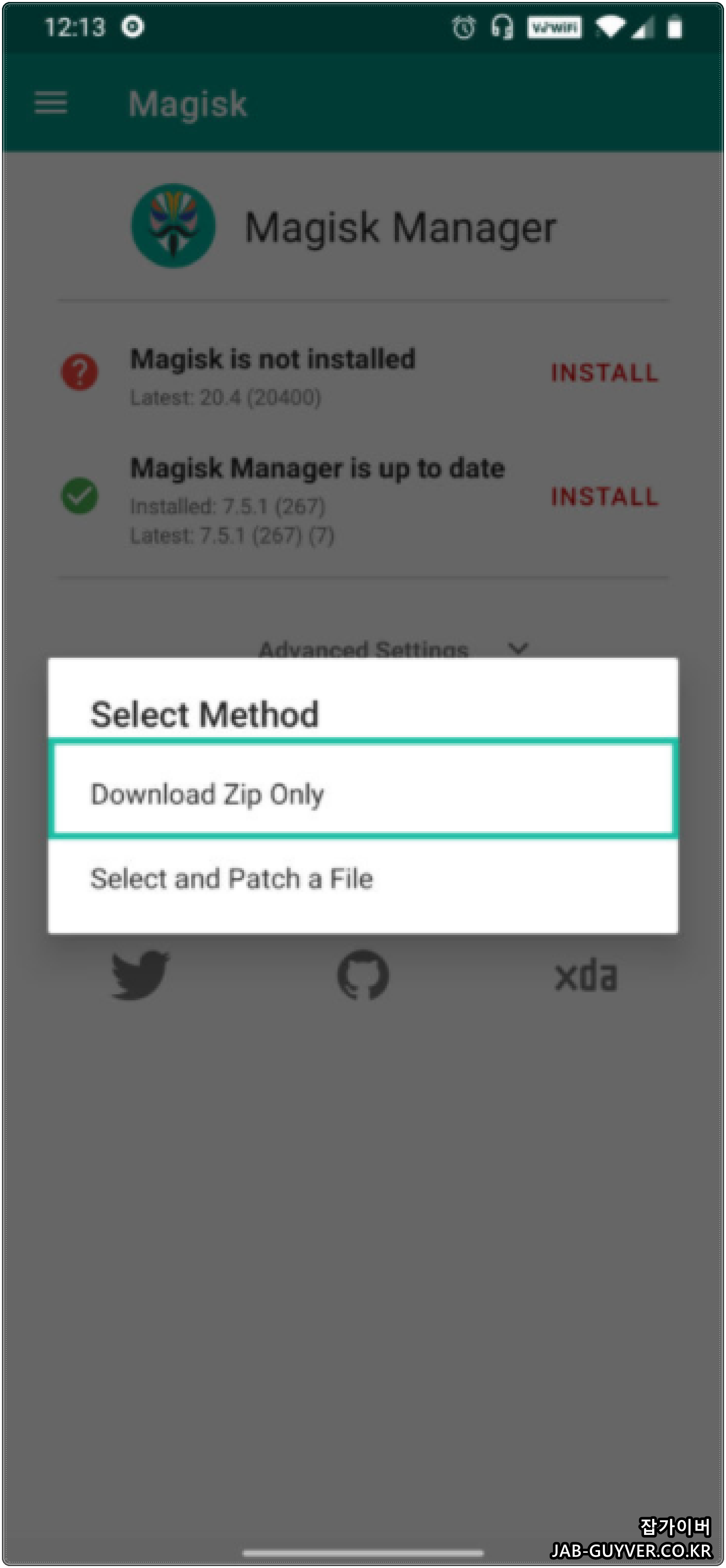 Install을 선택 후 아까 다운로드한 magisk.zip 파일을 선택해서 설치합니다.