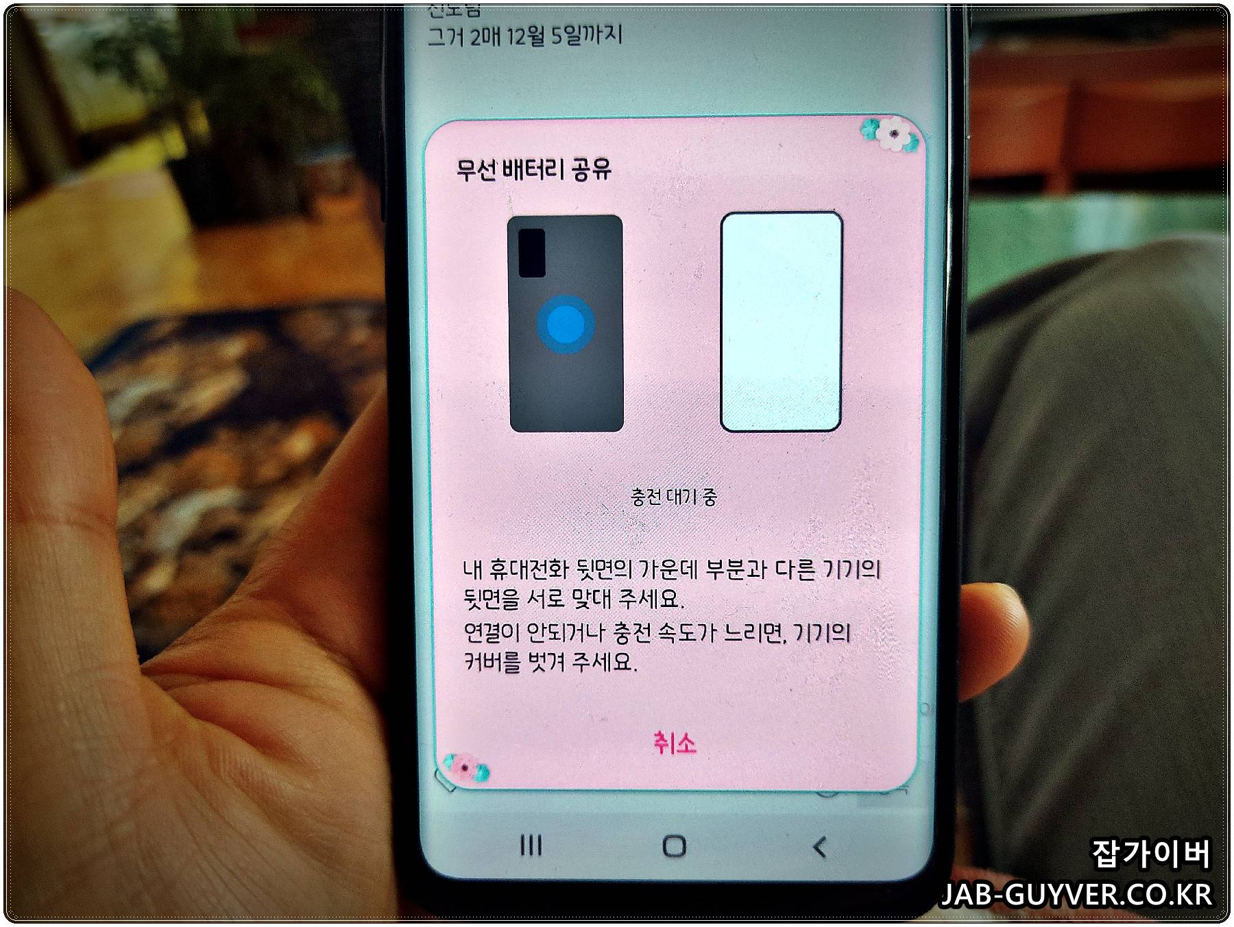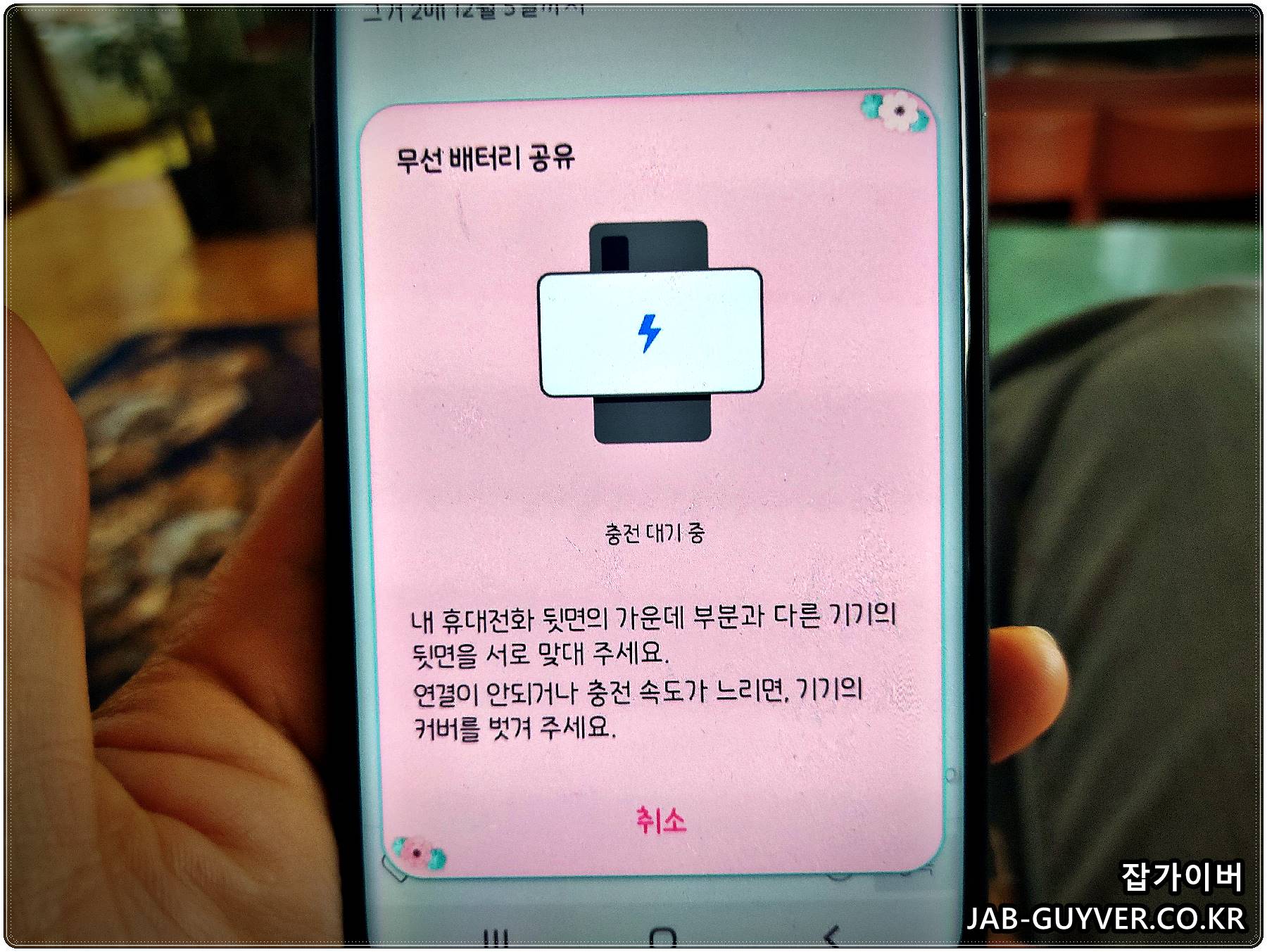 이후 휴대전화 뒷면 가운데에 갤럭시워치 및 다른 핸드폰을 올려두면 무선충전 배터리공유가 가능합니다.