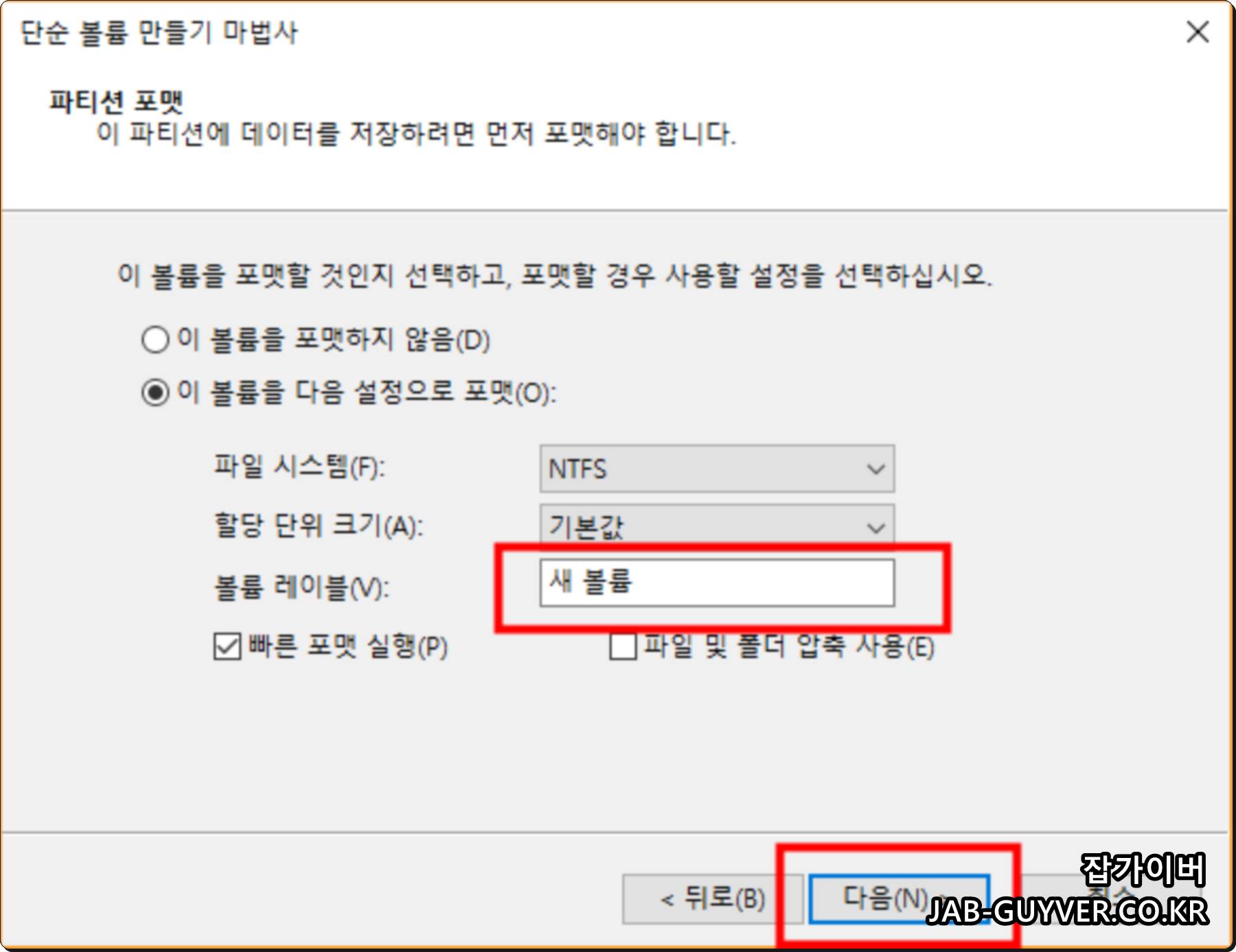 여기서 볼륨 크기와 드라이브 문자를 정합니다.