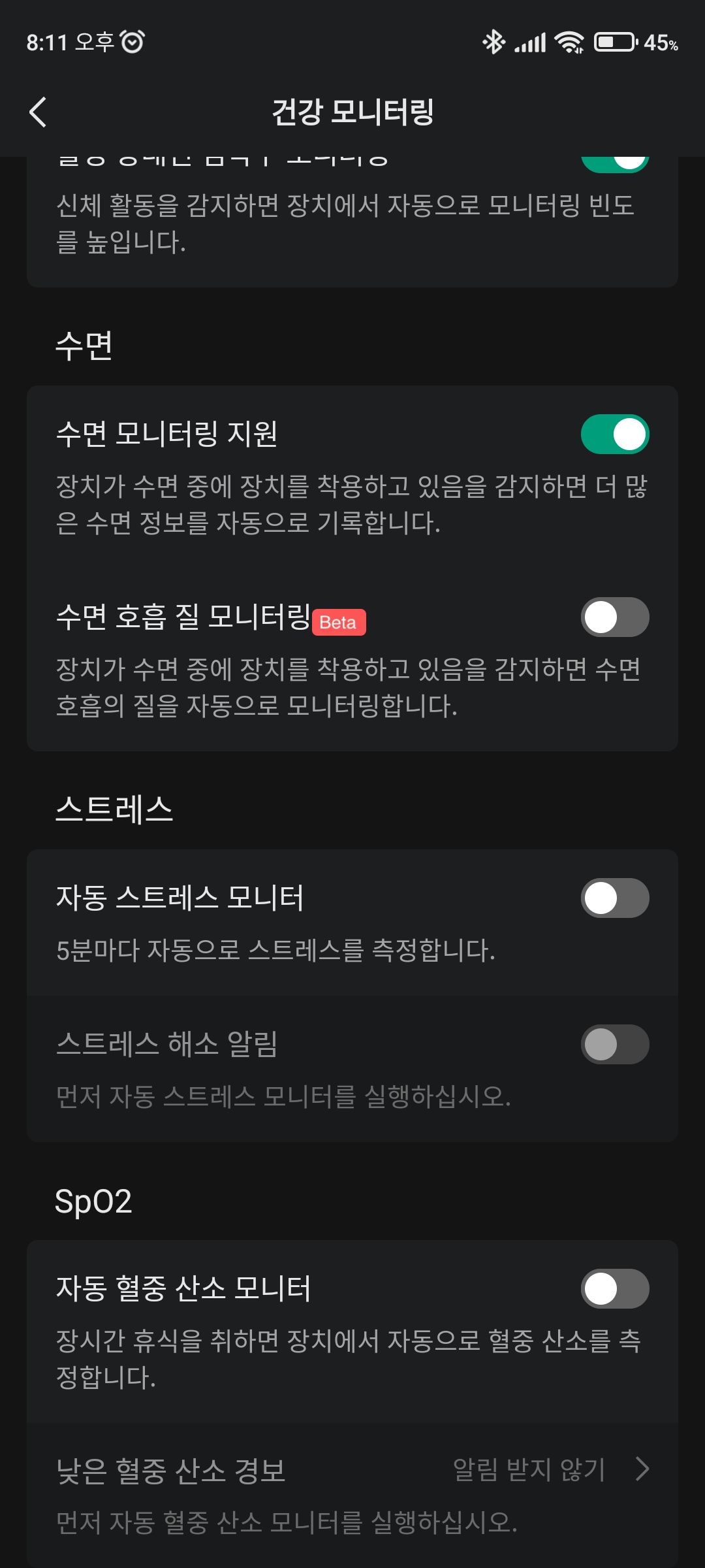 수면 측정, 심박수, SP02 측정도 24시간 자동 측정을 켜둘 수 있어서 건강이 신경 쓰이는 시기에 한동안 데이터를 모아보는 것도 괜찮습니다. 다만 24시간 측정을 모두 켜두면 배터리 사용 시간이 줄어들 수 있다는 점은 감안해야 합니다.