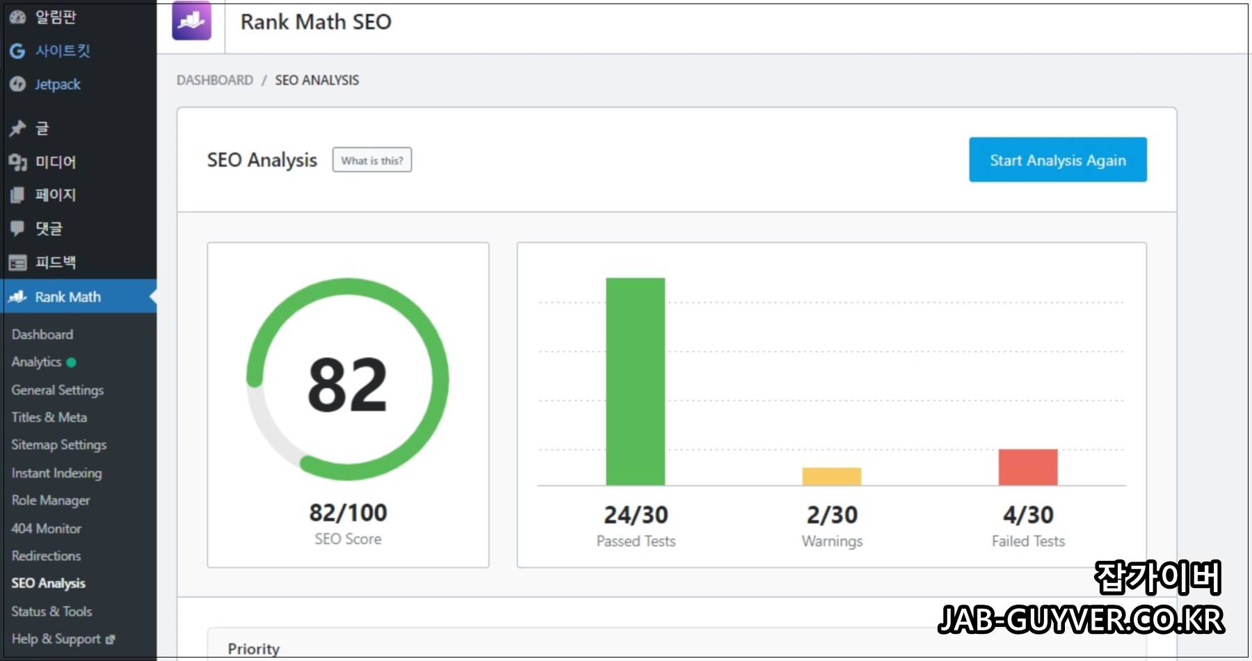 워드프레스 SEO를 위해서 Rank Math를 사용하는 경우 SEO Analysis를 사용하느것도 좋습니다.