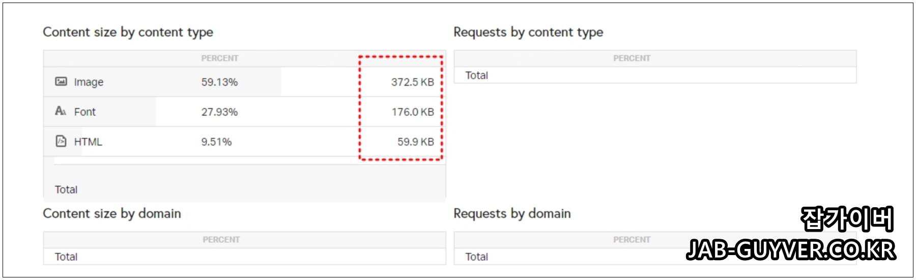 현재 콘텐츠 유형별로 스크립트 및 영상, 폰트, HTML, CSS의 용량을 확인할 수 있으며 이를 압축하기 전 체크합니다.