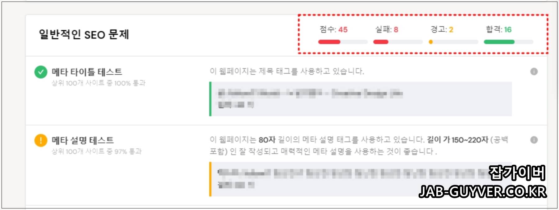 제목 및 내용등을 어떻게 작성하느냐에 따라 검색엔진에 노출이 달라지기 때문에 추천하는 방향으로 내용을 추가하고 이미지의 경우 ALT 속성을 누락된 부분을 추가합니다.