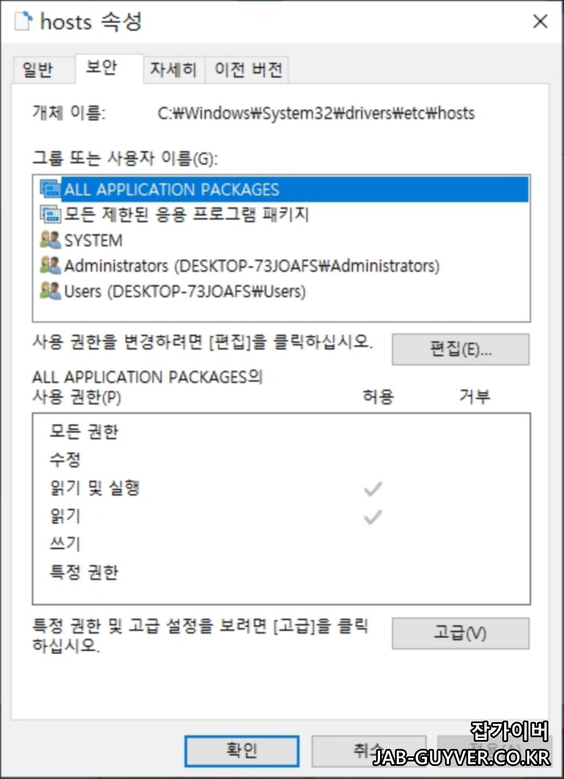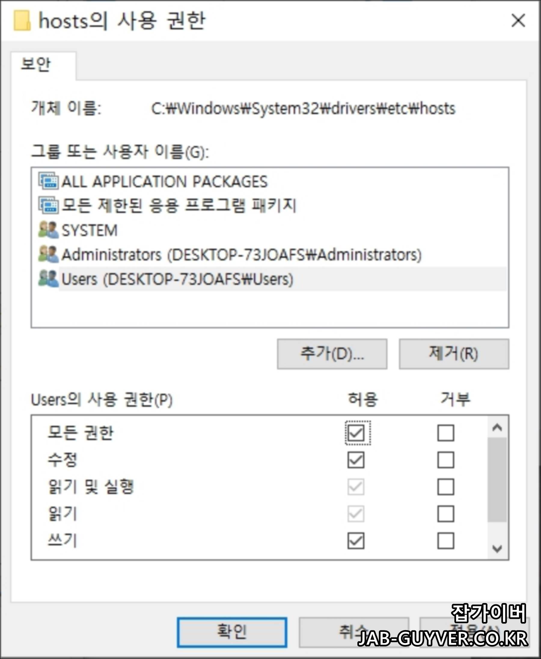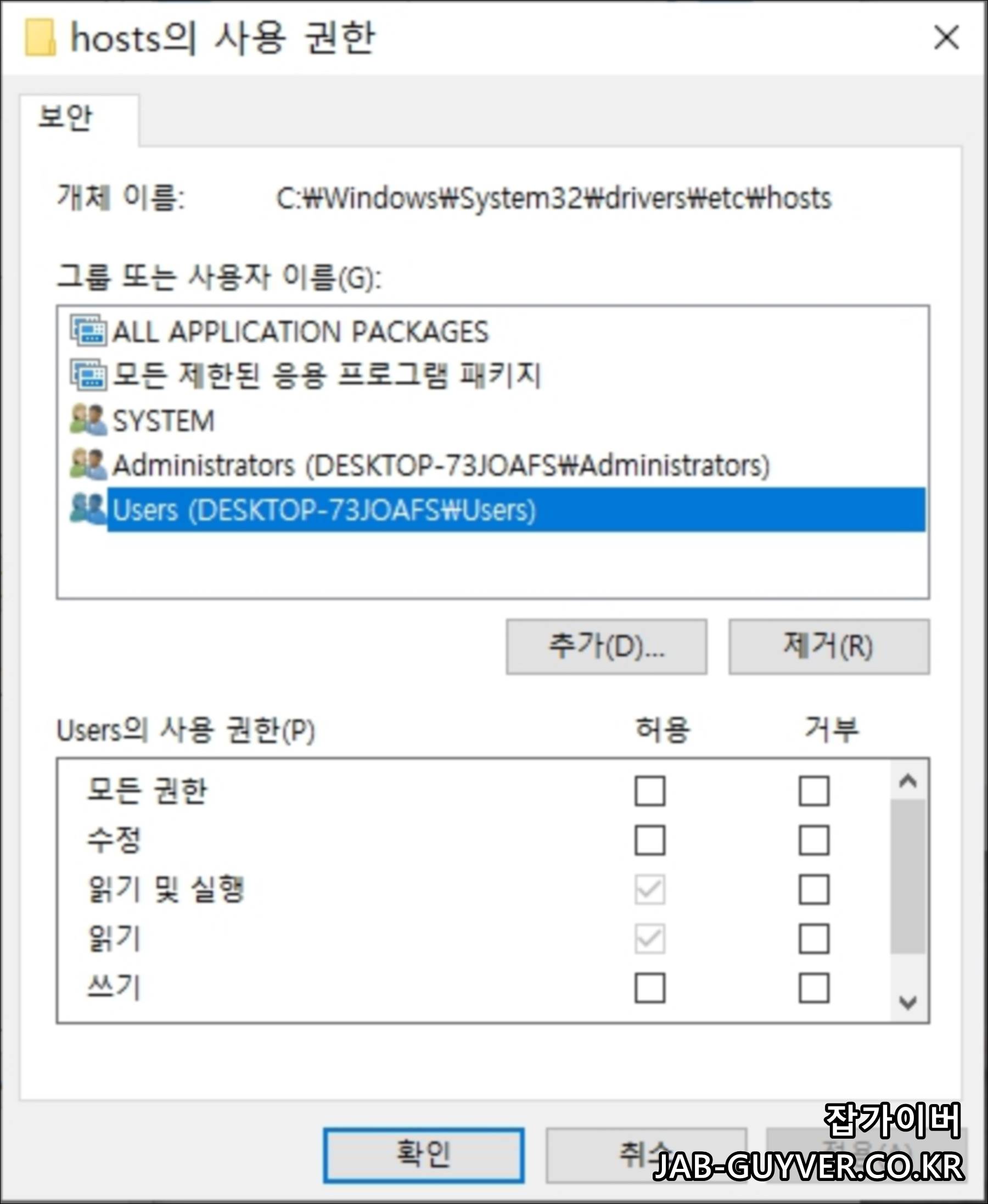 hosts 파일 읽기/쓰기 권한을 직접 부여