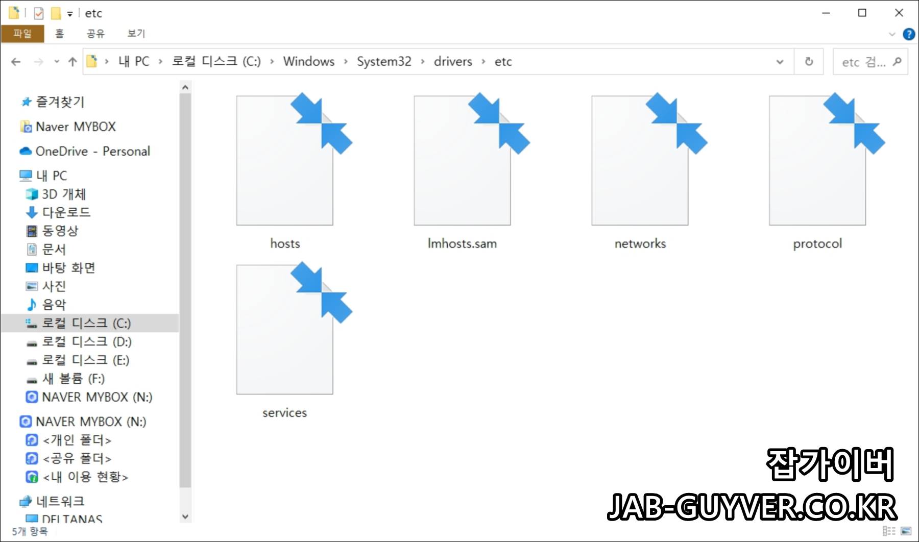 파일 확장자가 .txt로 붙지 않도록 주의하며, 원래 위치인 C:\Windows\System32\drivers\etc 폴더에 넣으면 됩니다. 저장 전 백업은 필수입니다.