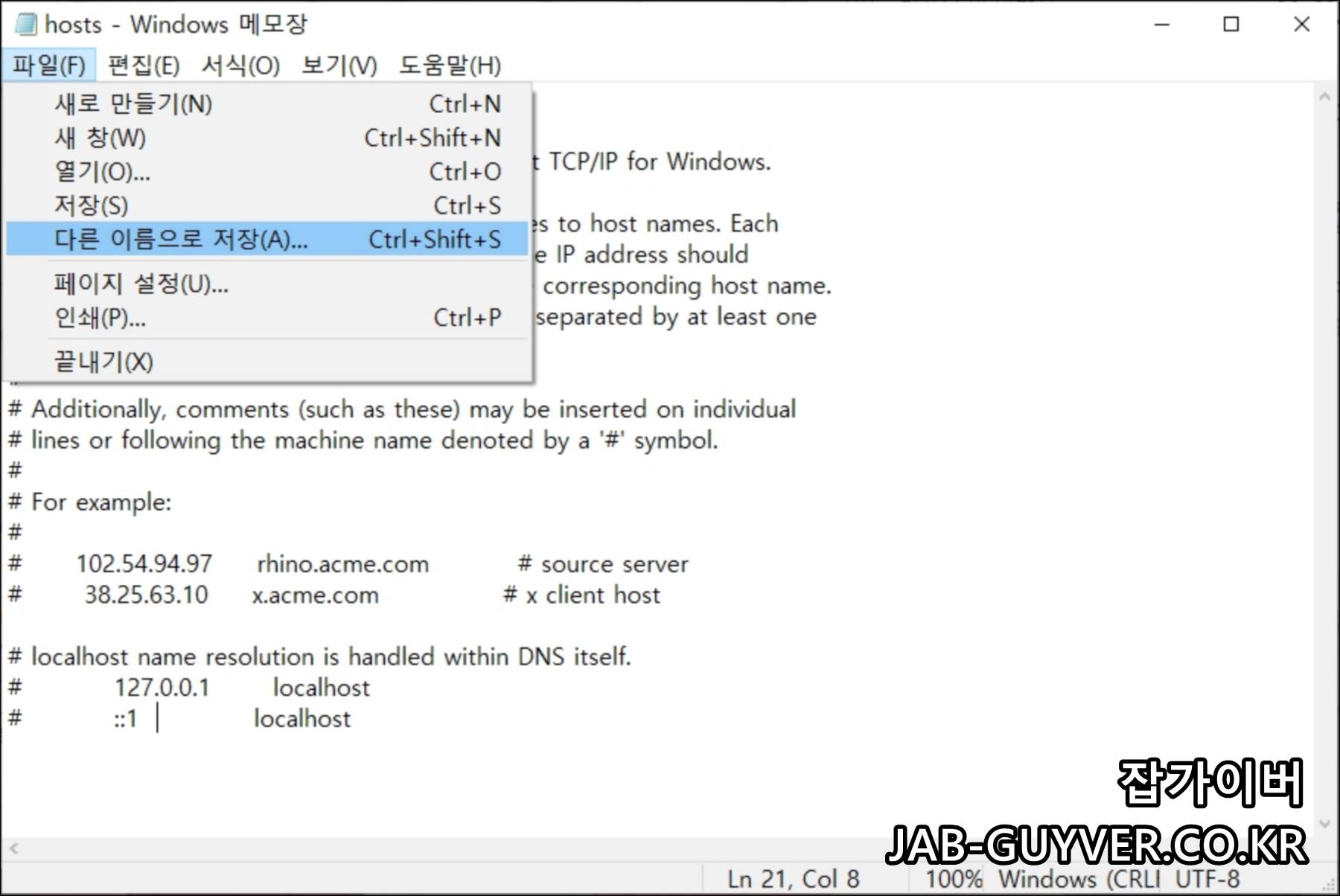 메모장에서 hosts를 열어 수정한 뒤, etc 폴더에 바로 저장하지 말고 바탕화면에 먼저 저장합니다.