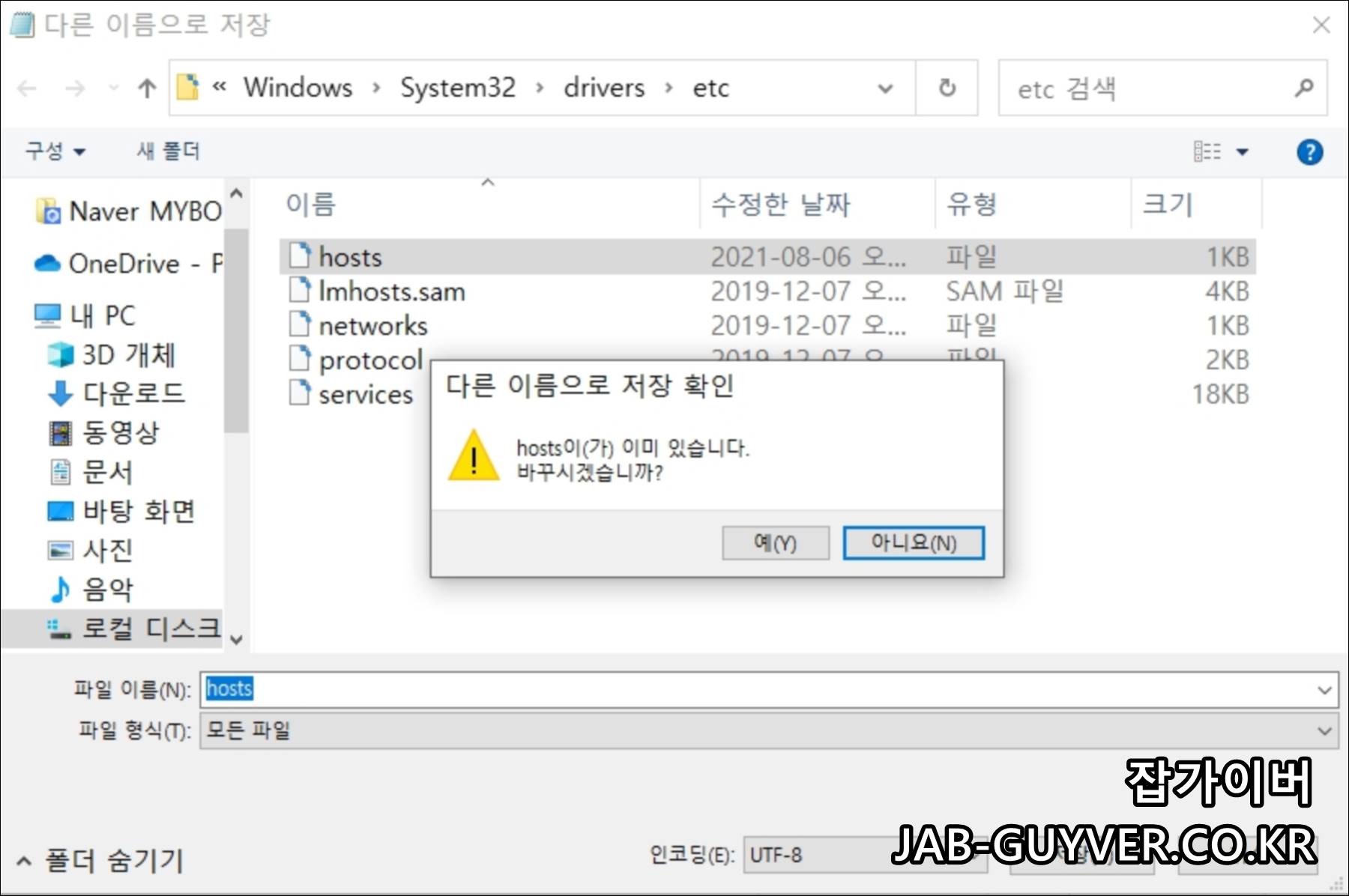 저장할 때는 파일 형식을 모든 파일로 바꾸고 파일명을 hosts로 저장해야 합니다.