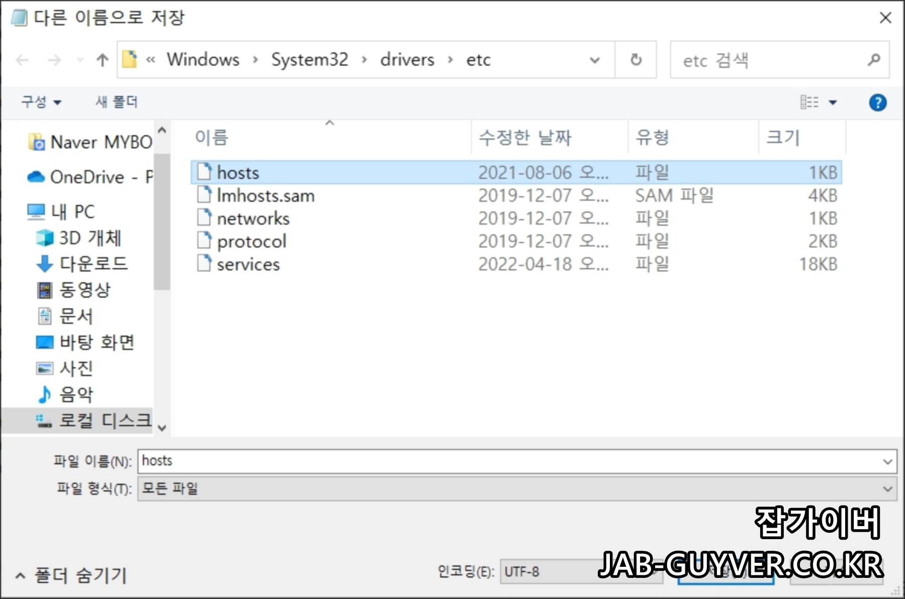 파일형식을 모든파일로 변경 후 hosts 파일로 저장합니다.