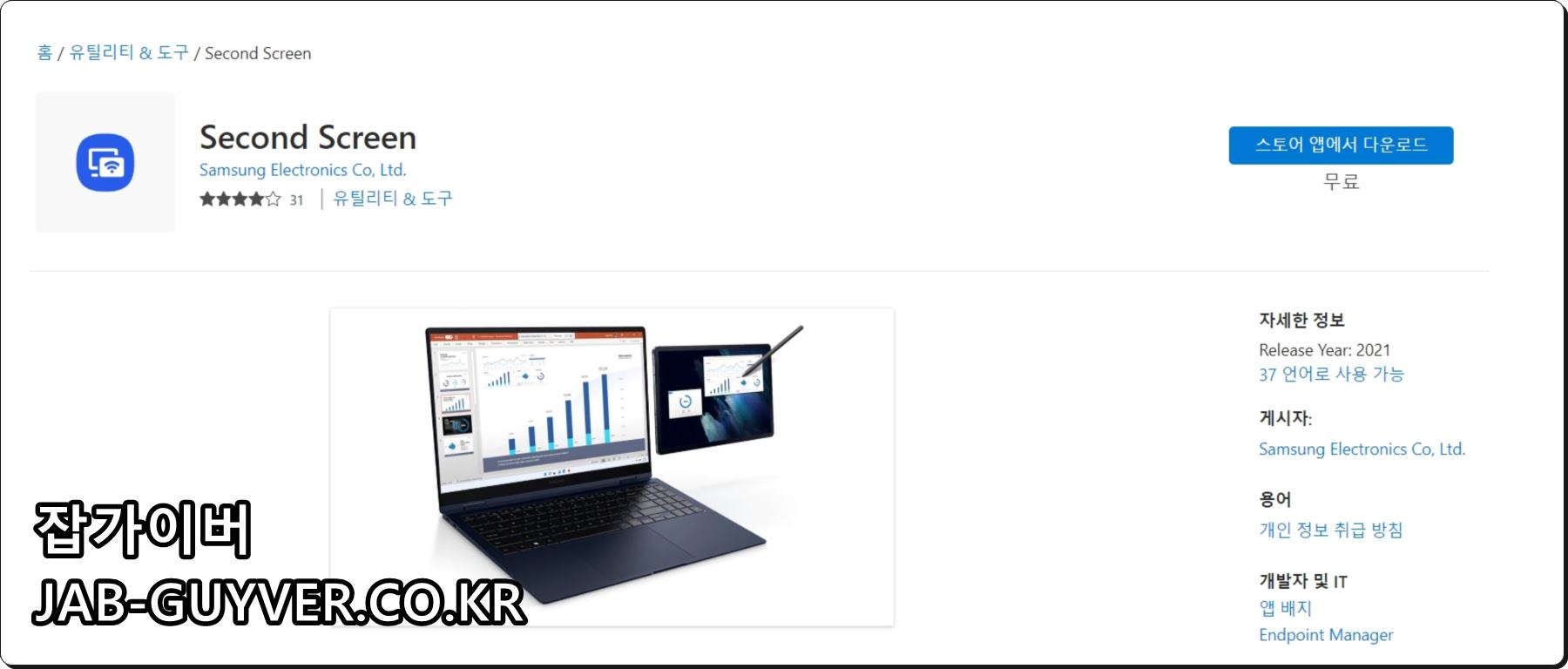 - 미탑재 기종은 Microsoft Store 또는 Galaxy Store에서 '세컨드 스크린' 검색 후 설치