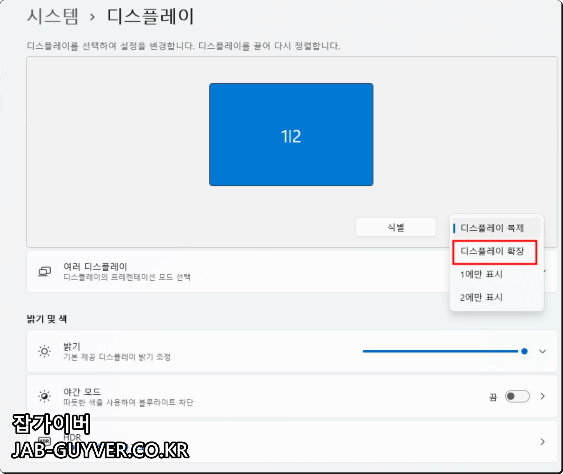 모니터는 확장 외에도 윈도우 키 + P를 눌러 복제, 확장, 디스플레이1 끄기, 디스플레이2 끄기 등이 가능합니다.