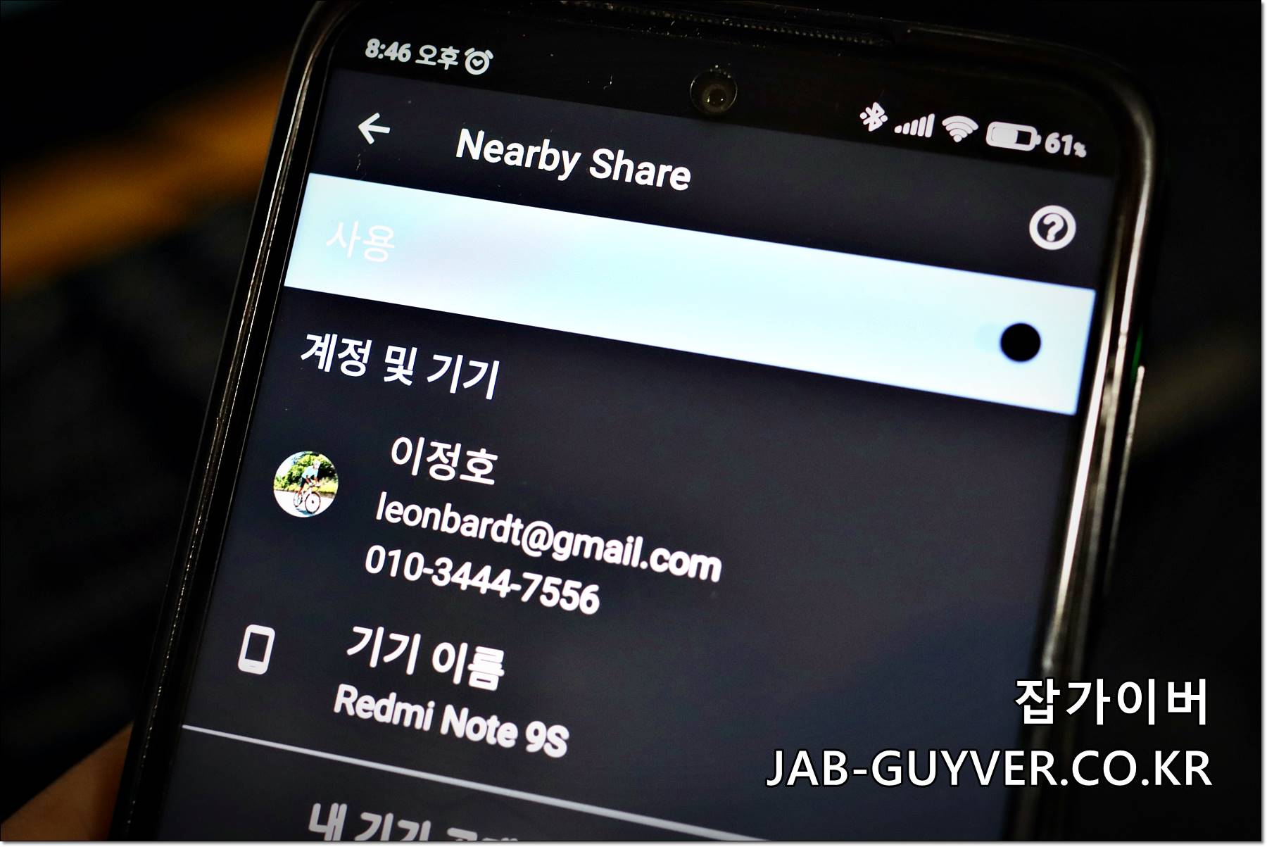 Nearby Share 사용하기 위해서는 구글 계정에 연동 후 사용을 활성화합니다.