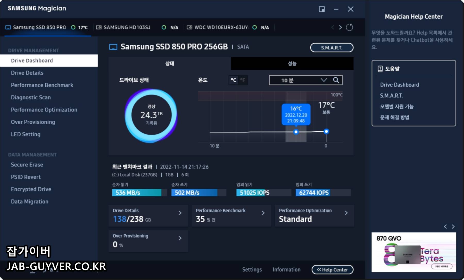 저라면 처음 설치한 뒤에는 대시보드 → Drive Details → SMART → Benchmark → Performance Optimization 순서로 먼저 확인해보는 편입니다.