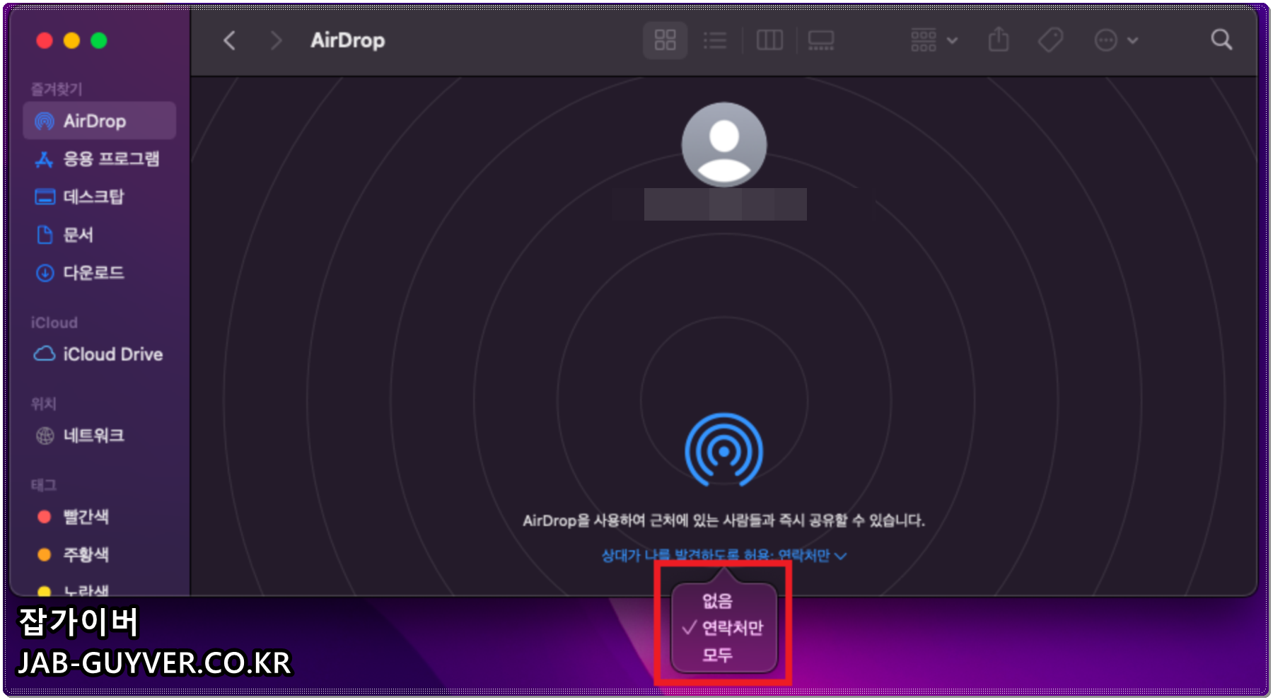 맥북도 비슷합니다. Finder에서 AirDrop을 열었을 때 하단에 “나를 발견 가능하게 허용” 항목이 나오는데, 여기에서 없음 / 연락처만 / 모두 중 어떤 값으로 되어 있는지 확인합니다.