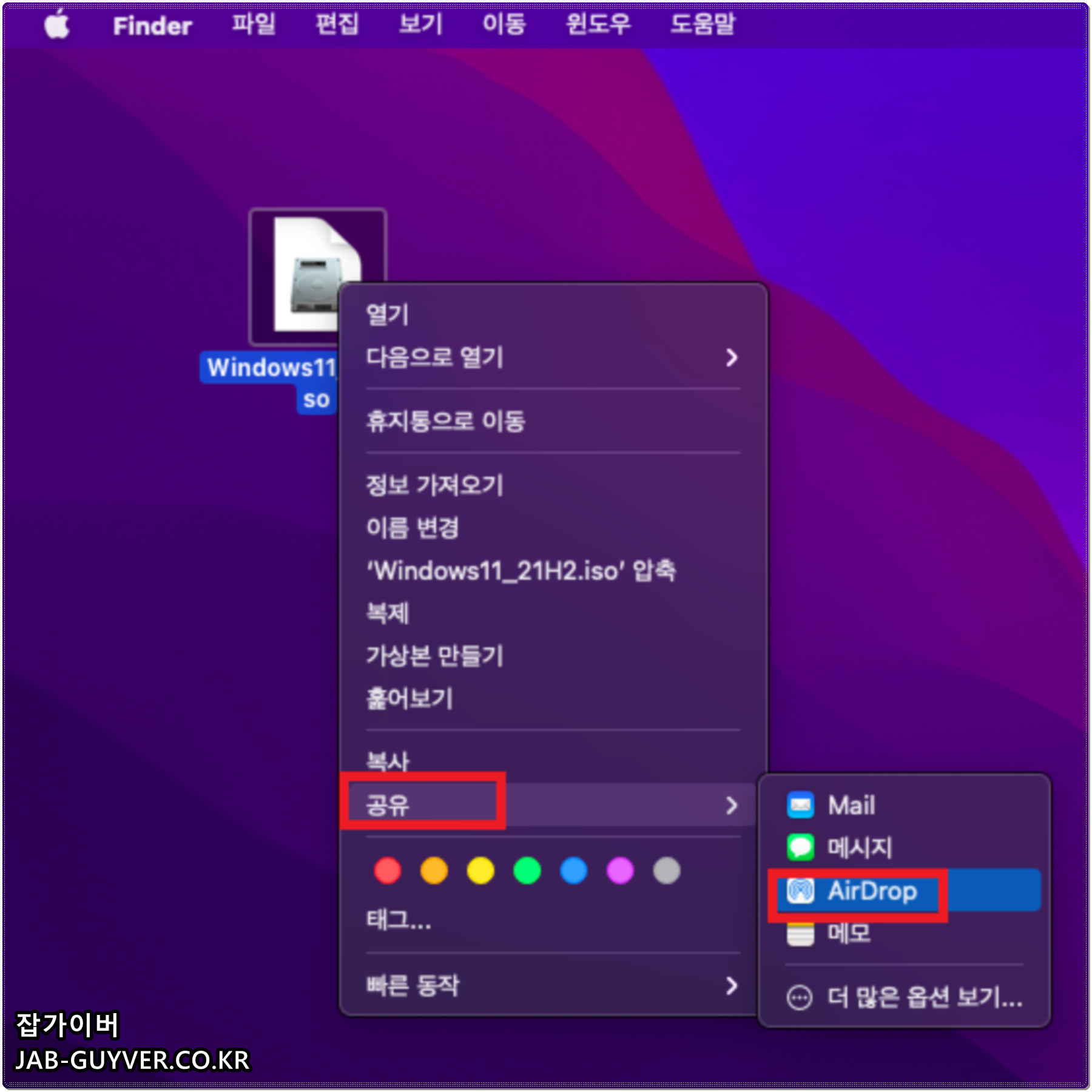 에어드롭을 켠 상태에서 파일을 보내고 싶다면, 전송할 파일 위에서 마우스 우클릭 후 공유 > AirDrop을 선택합니다.