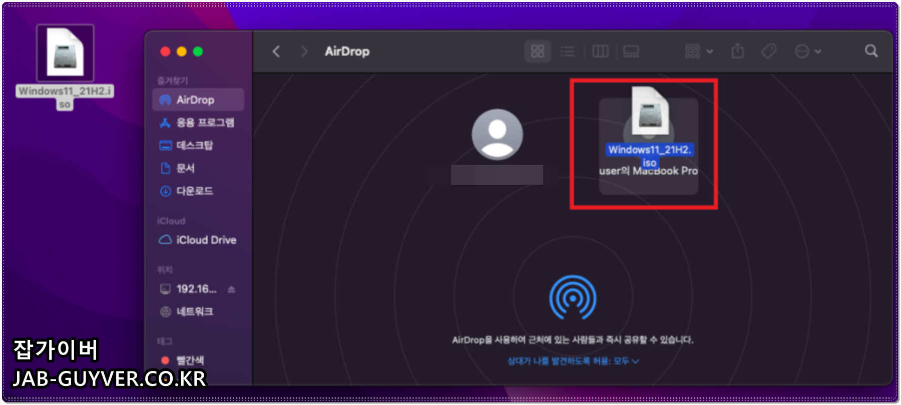 여기에서 원하는 대상 아이콘을 선택하면 전송이 시작됩니다. Finder의 사이드바에서 AirDrop을 연 뒤, 전송할 파일을 해당 아이콘 위로 끌어다 놓는 방식으로 보내는 것도 가능합니다.