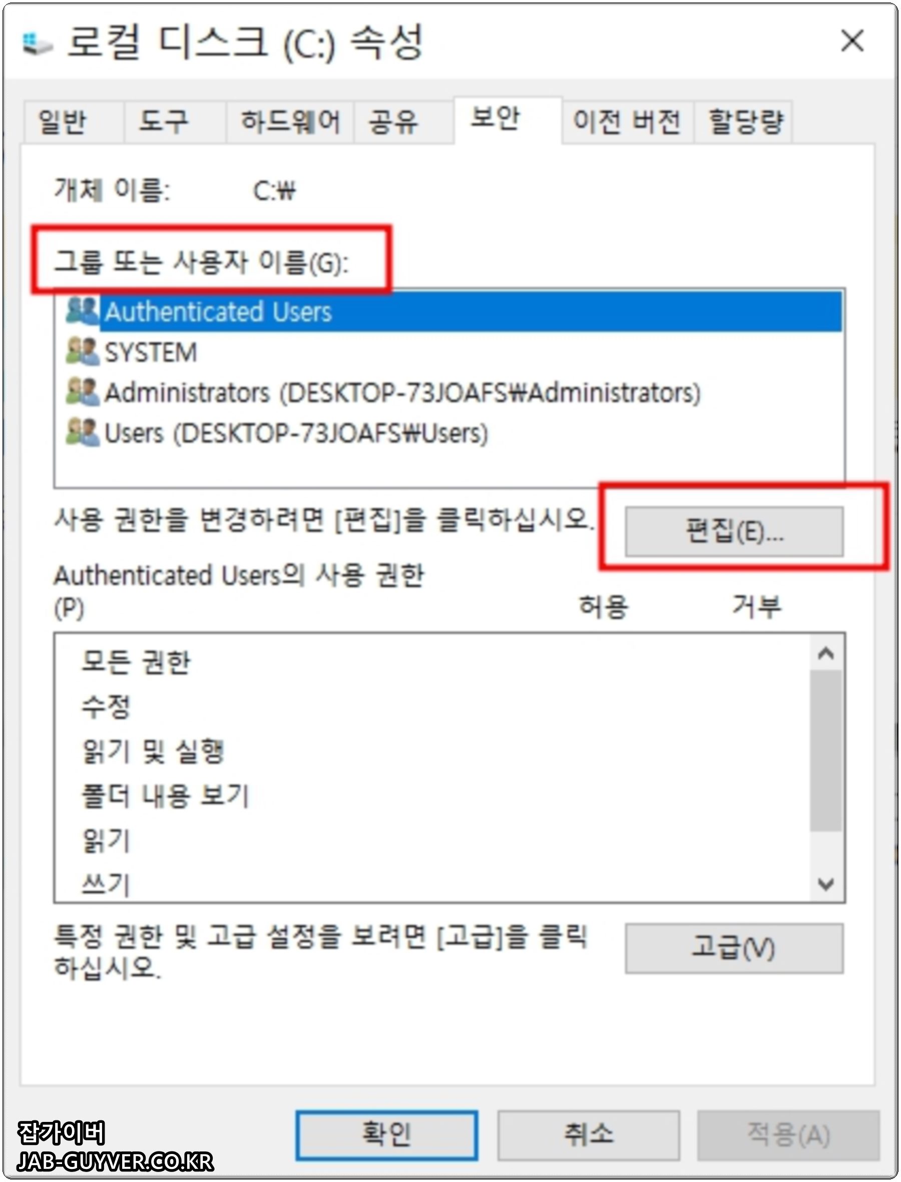 - 보안 탭으로 이동한 뒤 편집 버튼을 눌러 권한 창을 연다.