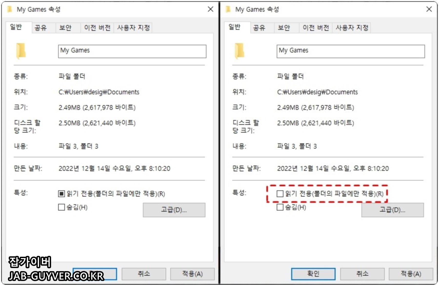 하단에 읽기 전용 항목이 체크되어 있다면 해제한 뒤 적용한다.