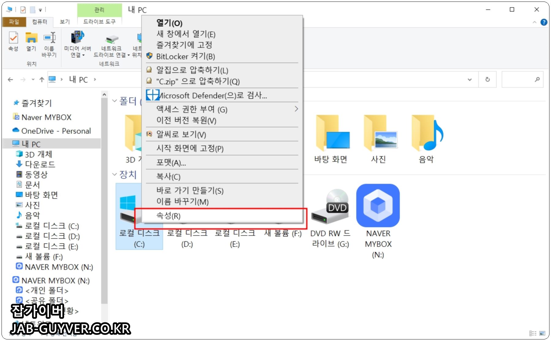 먼저 C: 드라이브 아이콘을 마우스 오른쪽 버튼으로 클릭해 속성을 연다.