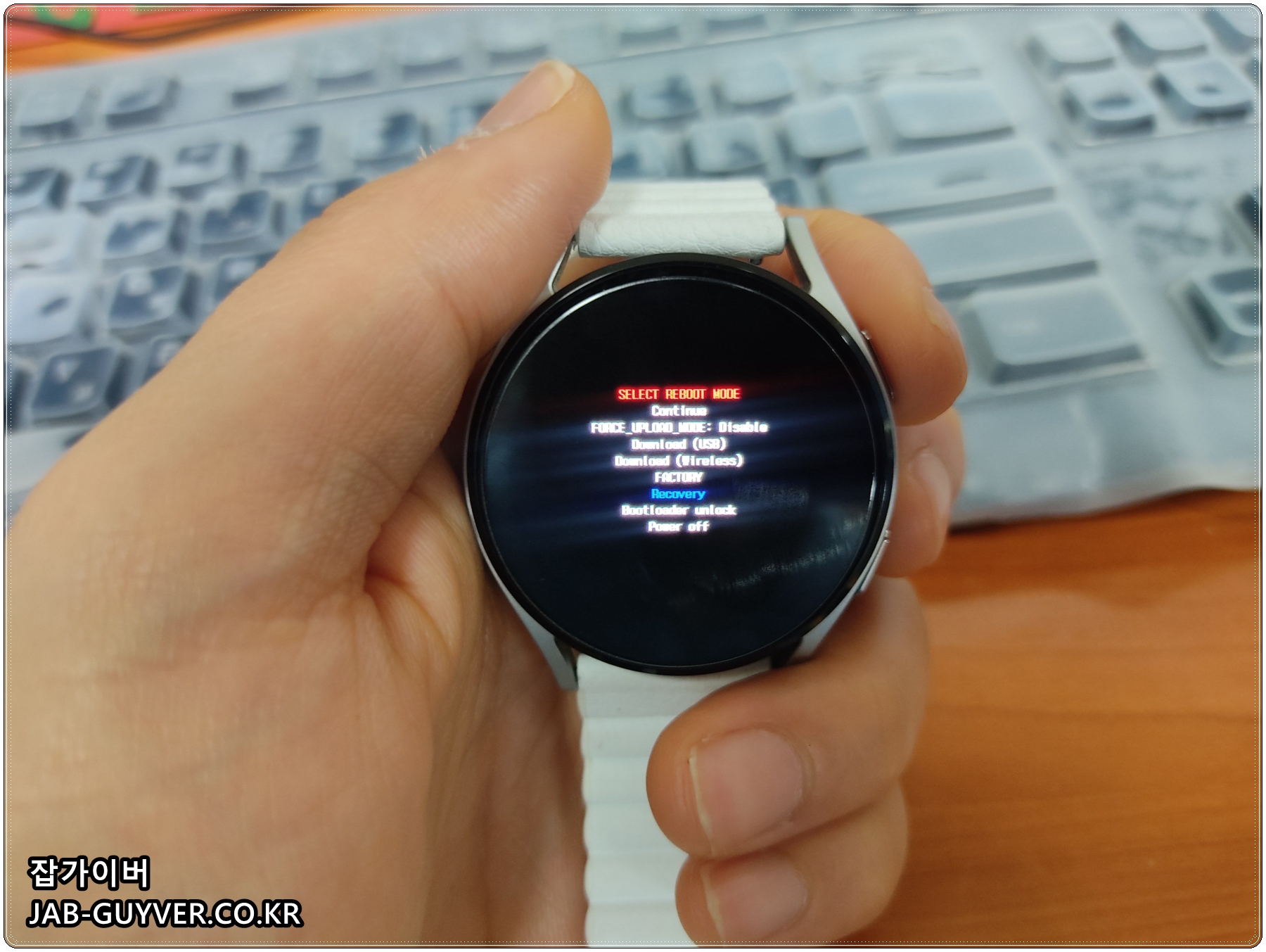 갤럭시워치 상단버튼을 눌러 이동하고 상단버튼을 꾸욱 눌러 선택할 수 있으며 리커버리 모드로 부팅 시 각 메뉴는 아래와 같습니다.