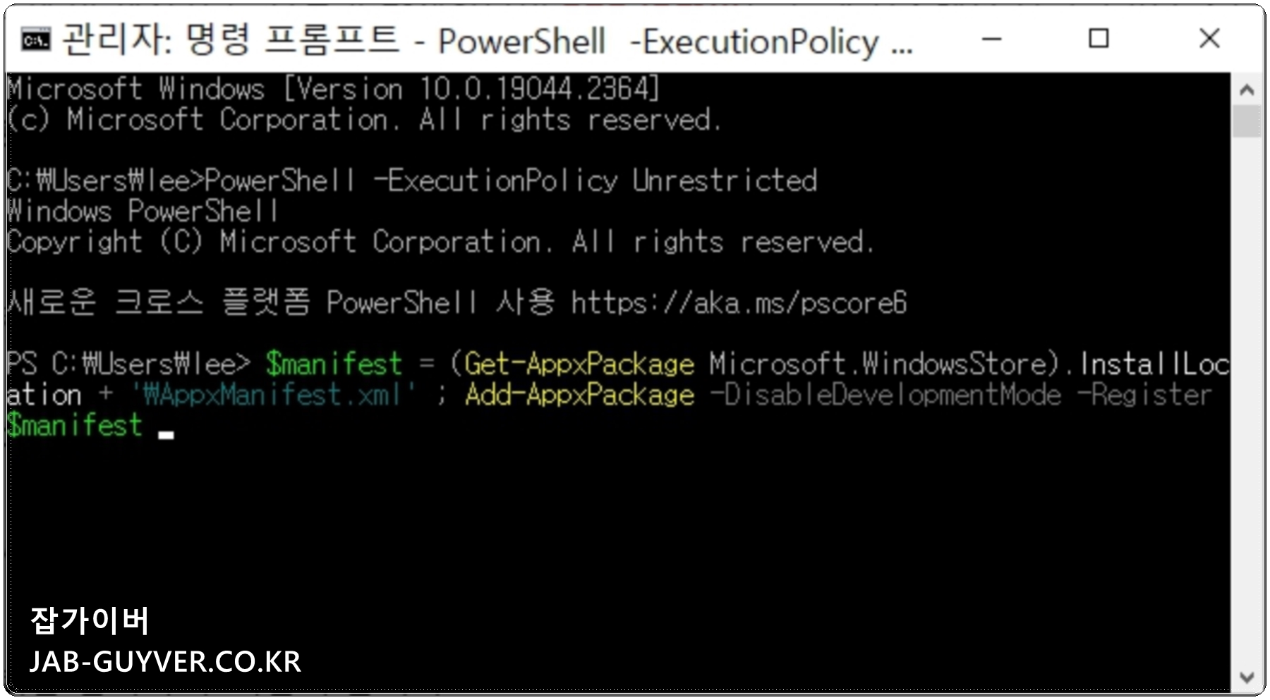 스토어 패키지는 남아 있는데 등록 정보만 꼬인 느낌이라면, 명령 프롬프트에서 PowerShell을 불러와 스토어를 다시 등록하는 방법이 있습니다.