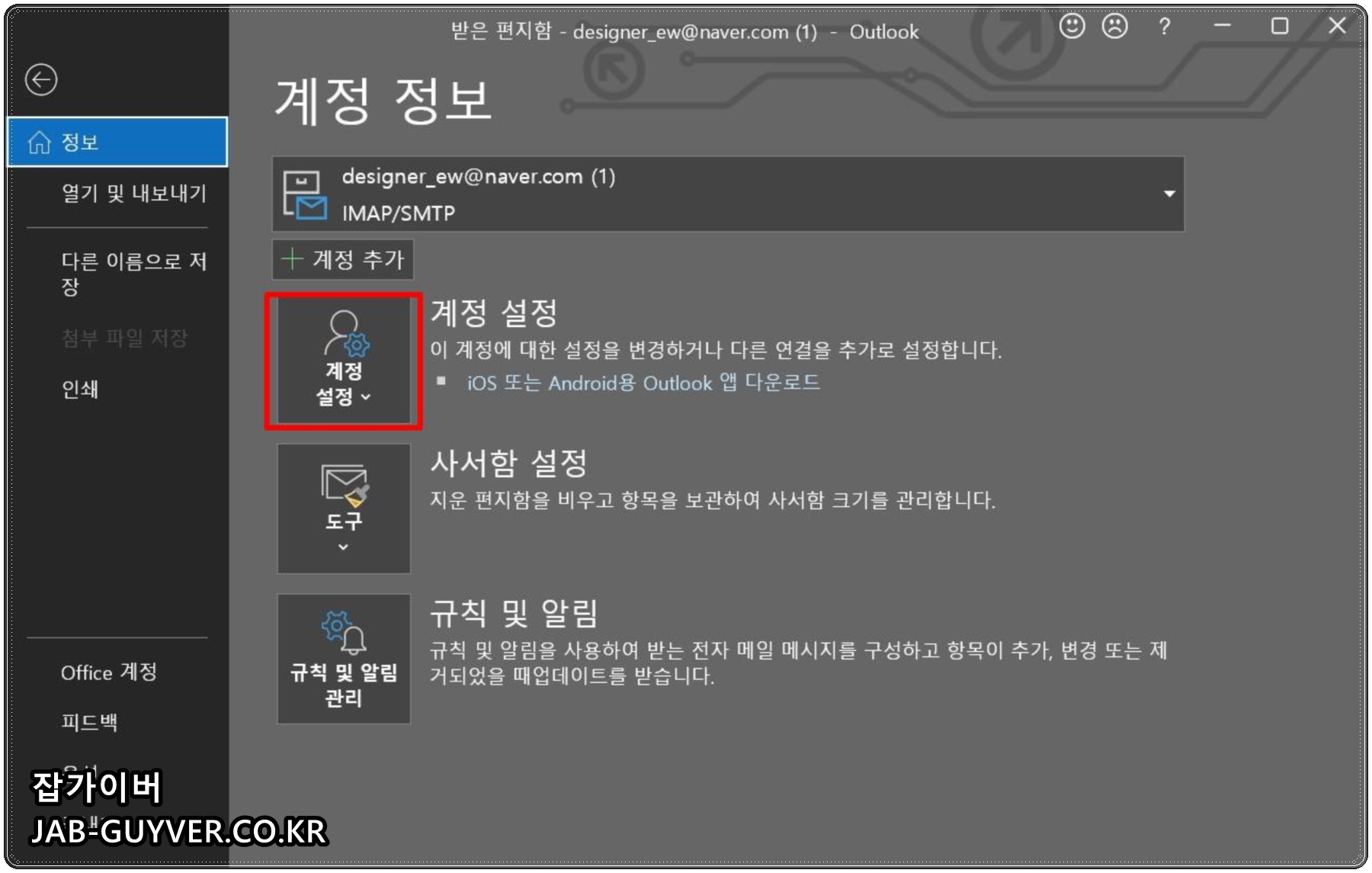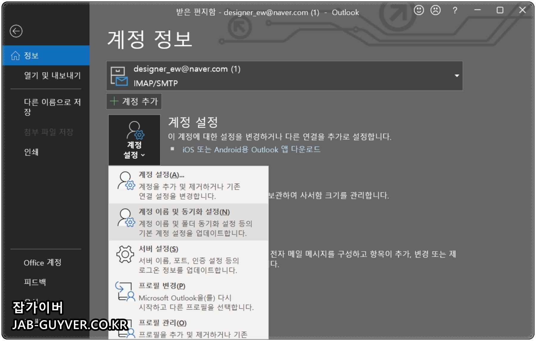 아웃룩 실행 후 파일 -> 설정 -> 계정설정 -> 서버설정으로 들어갑니다.