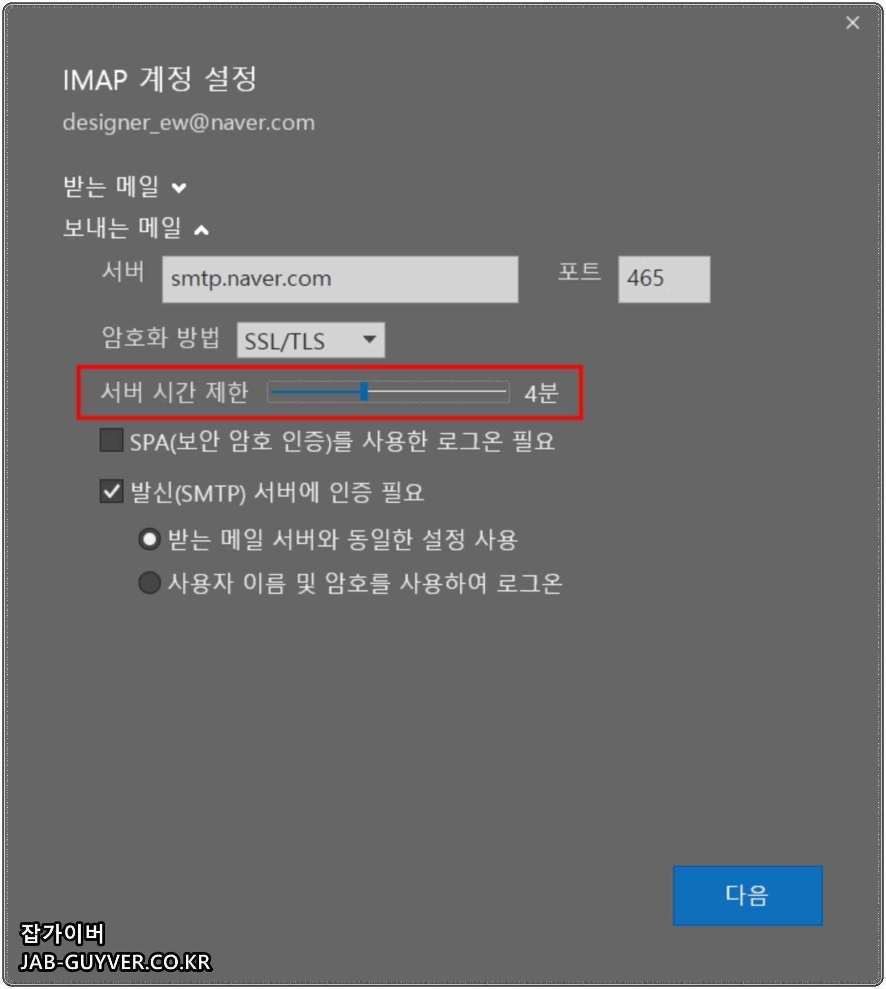 그리고 받는 메일서버와 동일한 설정 사용으로 체크합니다.