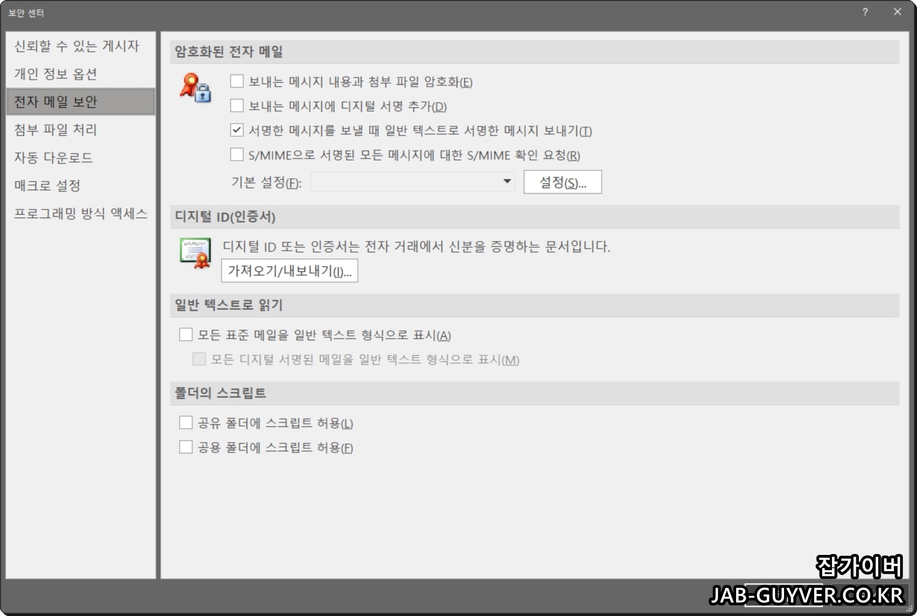 | 전자메일 보안 설정 | Outlook > 파일 > 옵션 > 트러스트 센터 > 전자메일 보안 > 디지털 ID 가져오기 클릭 |