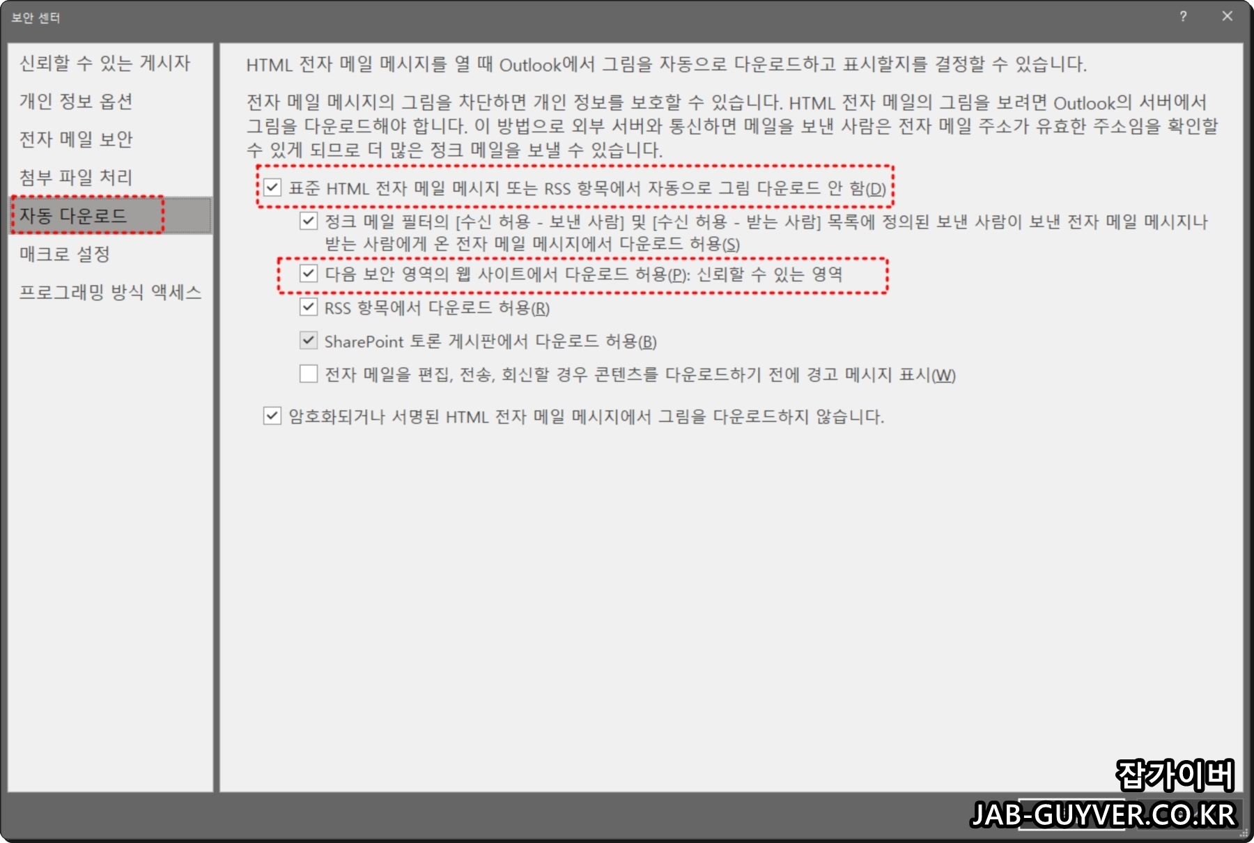 그 외에도 자동 다운로드에서 표준 HTML 전자메일 메시지에서 자동으로 다운로드하거나 다음 보안영역의 웹사이트에서 다운로드 시 신뢰할 수 있는 부분만 다운로드를 허용해줍니다.