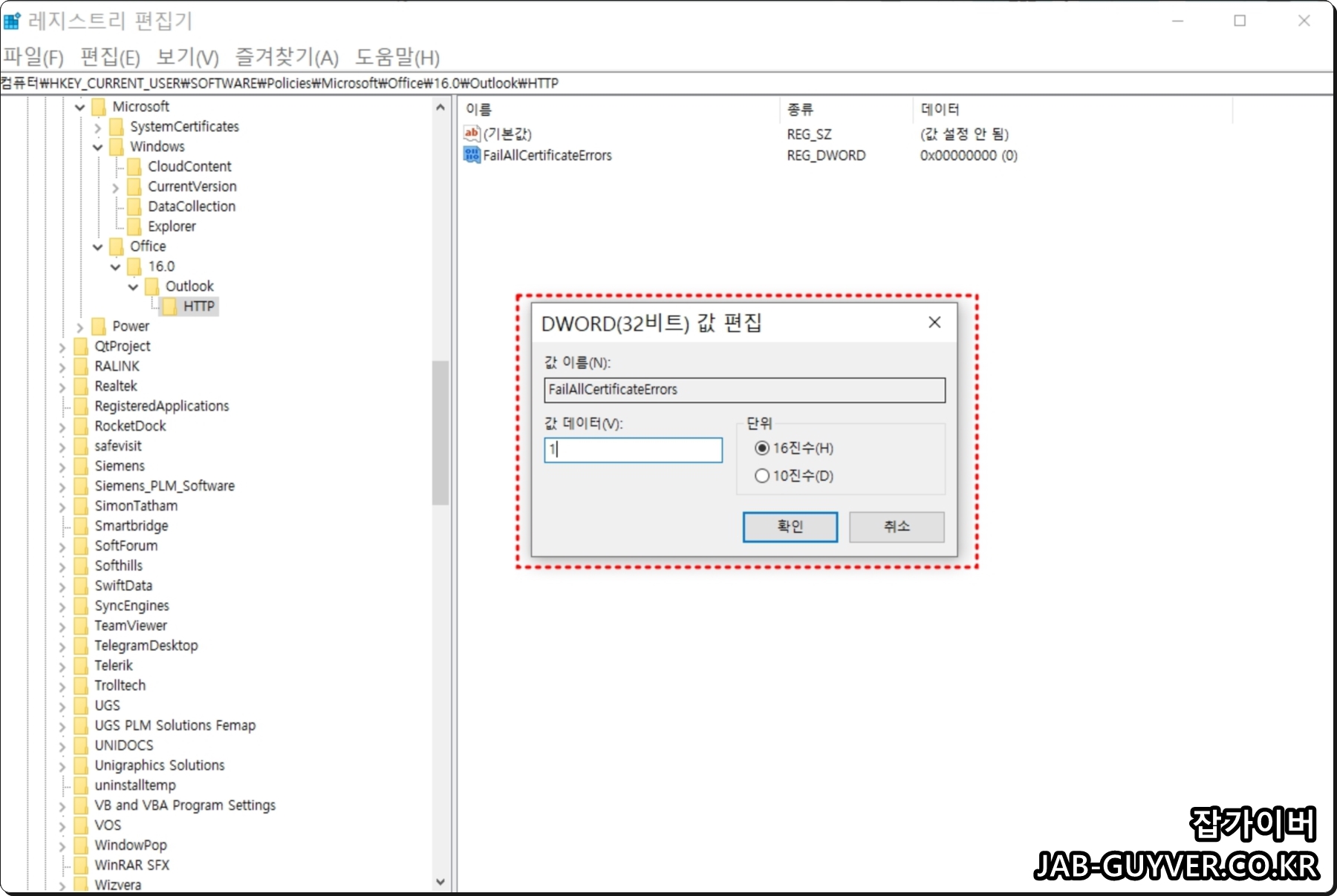 Dword 값 이름을 FailAllCertificateErrors 설정하고 수정으로 들어갑니다.