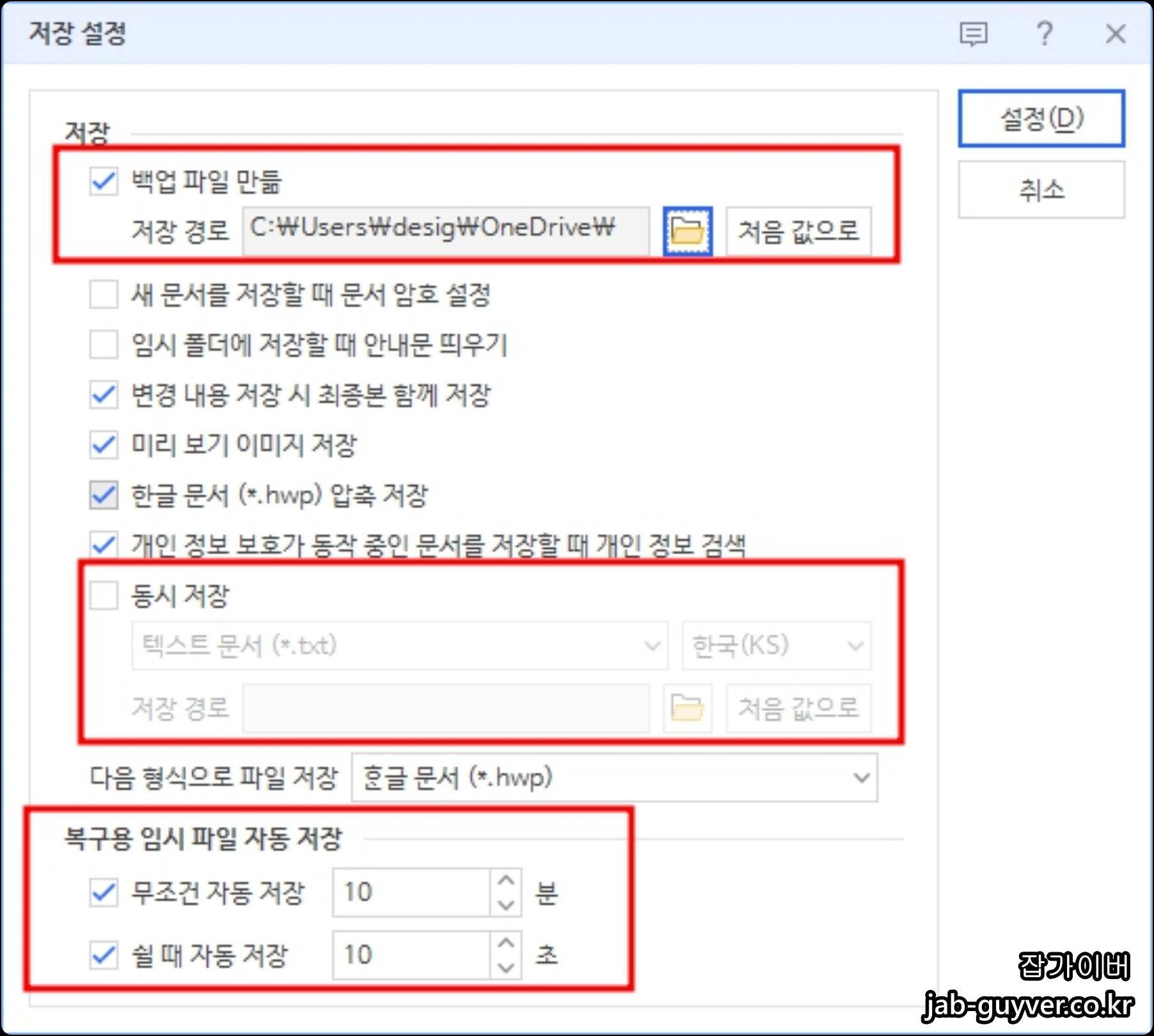 여기서 추천하는 방식은 백업 경로를 클라우드와 연결해 두는 것이다. 예를 들어 MS 원드라이브나 구글 드라이브 동기화 폴더 아래에 한글 백업 전용 폴더를 만들고 이곳을 지정하면, PC가 고장이 나도 백업 파일이 클라우드에 남는다.