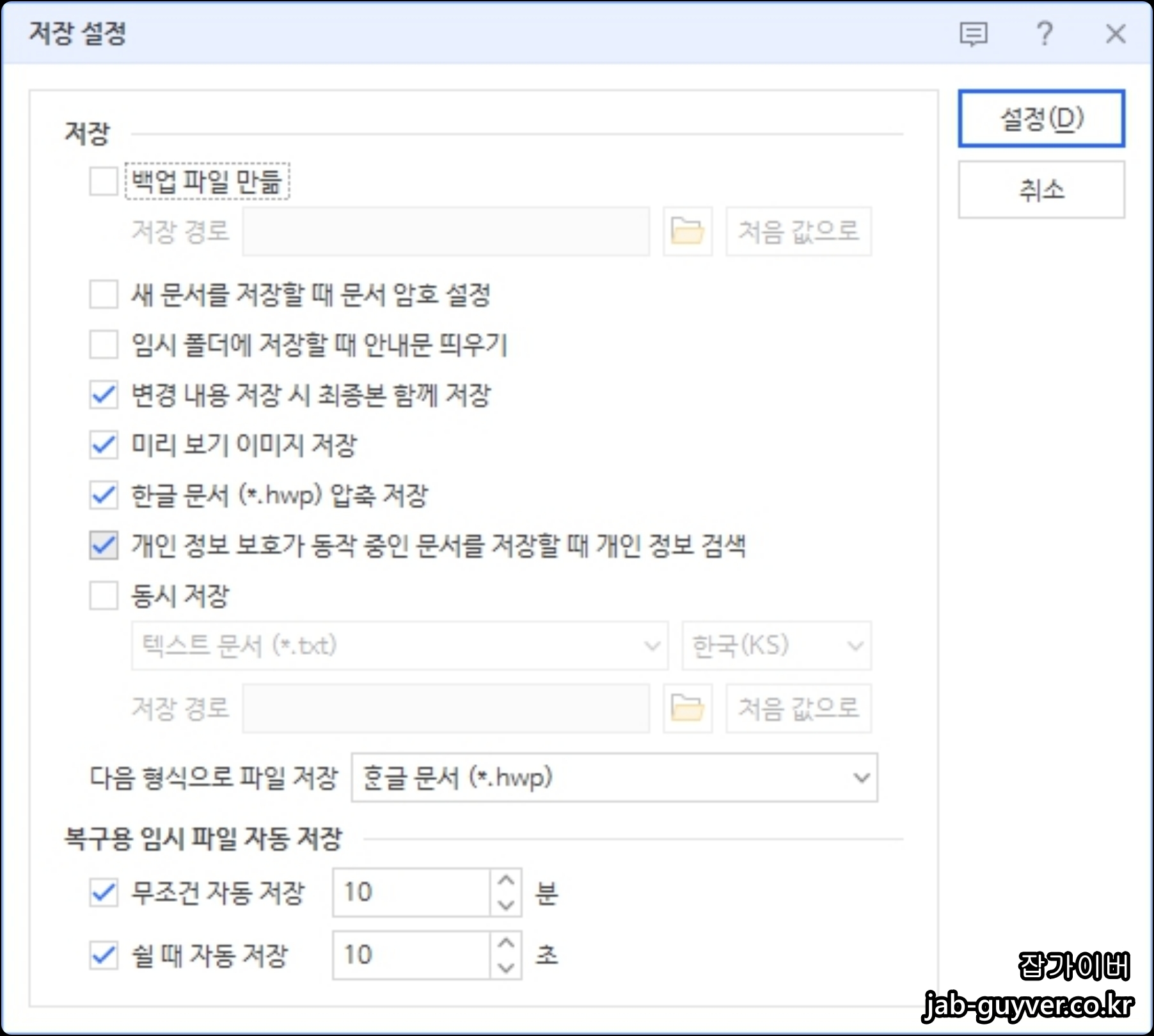 저장 설정 창에서는 한글 문서가 저장되는 방식과 백업 파일이 남는 위치를 한 번에 묶어서 관리할 수 있다. 보통은 백업 파일 전용 폴더를 만들어 두고, 이 경로를 지정해 두면 나중에 문서가 깨졌을 때 찾기가 훨씬 편하다.