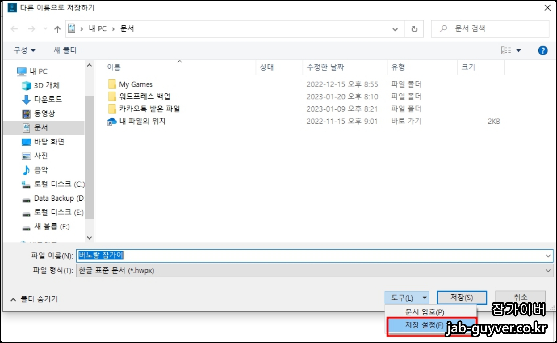 저장 창이 열리면 오른쪽 아래쪽에 있는 도구 항목을 클릭한다. 여기에서 저장 설정을 선택하면 한글2022가 문서를 어떤 방식으로 저장·백업할지 세부 옵션을 조정할 수 있다.