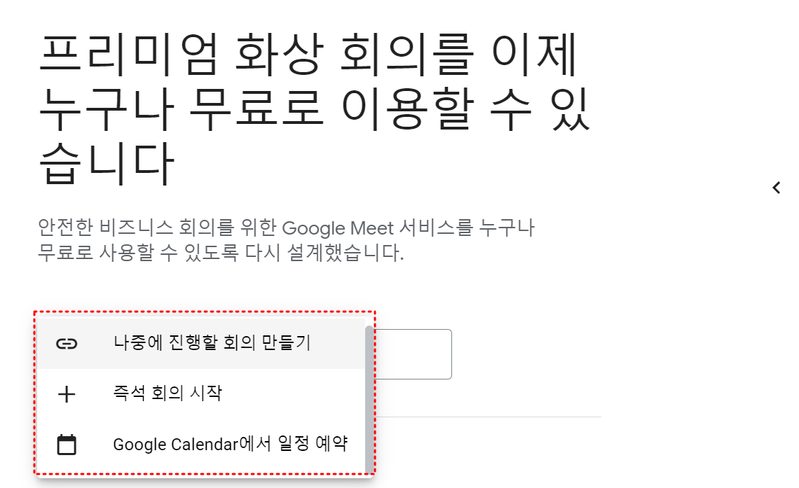 - 공유할 회의 링크를 가져오거나 즉석 회의를 시작하거나 Google 캘린더에서 통화 일정을 잡을 수 있습니다.