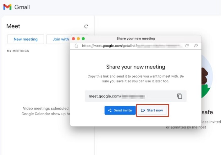 브라우저 탭에서 Gmail을 열면 Google이 Gmail에서 쉽게 회의를 시작할 수 있으므로 Meet의 웹 페이지로 이동할 필요가 없습니다.
