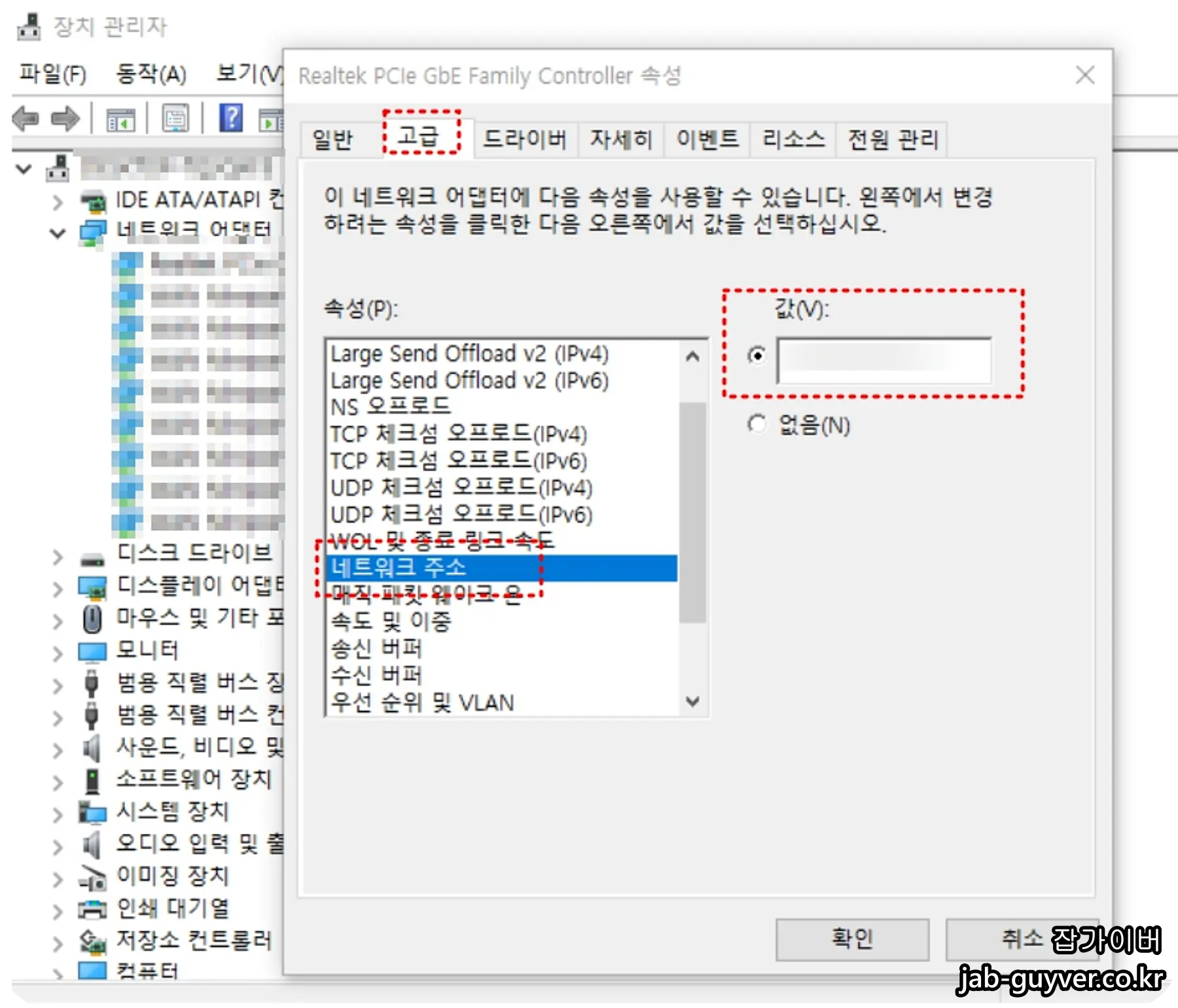 윈도우에서 가장 “정석”은 Network Address(또는 Locally Administered Address) 값을 쓰는 방식입니다. 다만 보안 강화된 드라이버는 해당 항목 자체가 숨겨져 있기도 합니다.