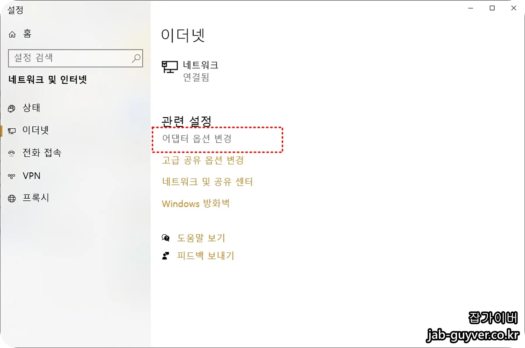 네트워크 상태에서 어댑터 옵션 변경으로 들어갑니다.