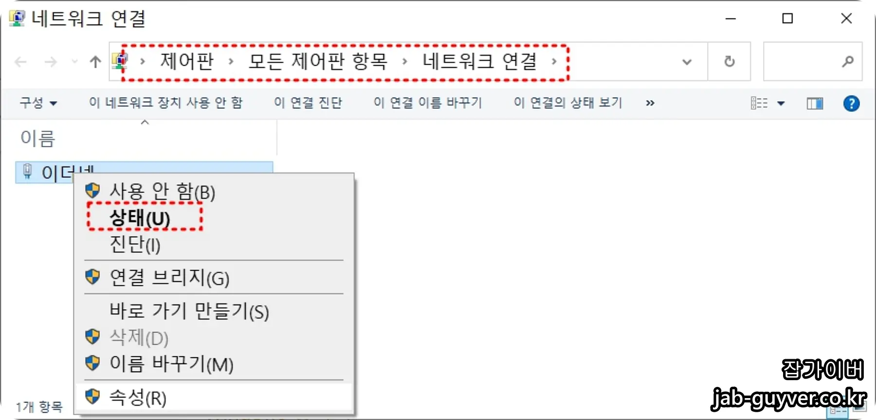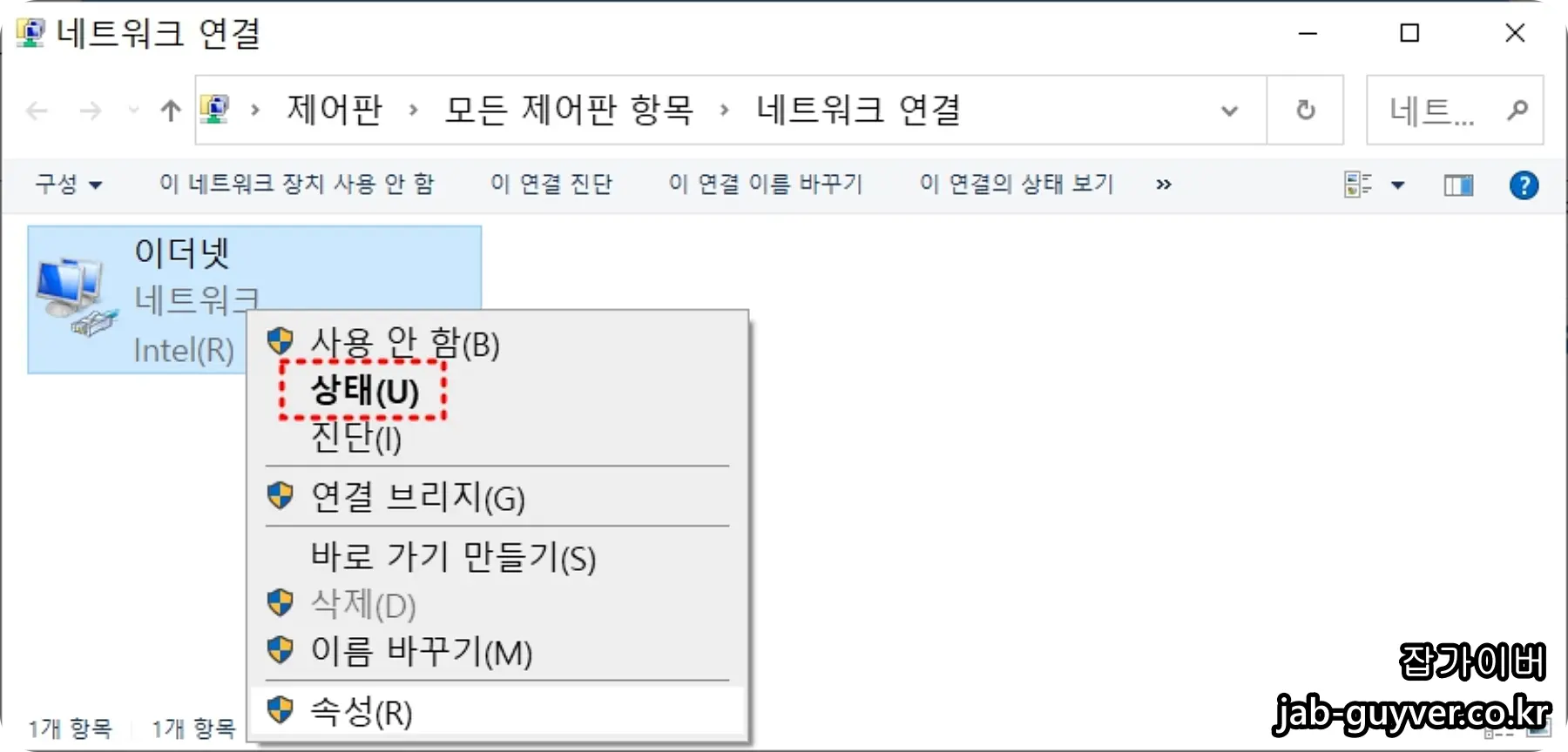 어댑터 옵션 변경에서 이더넷 상태 → 속성으로 들어가면 됩니다.