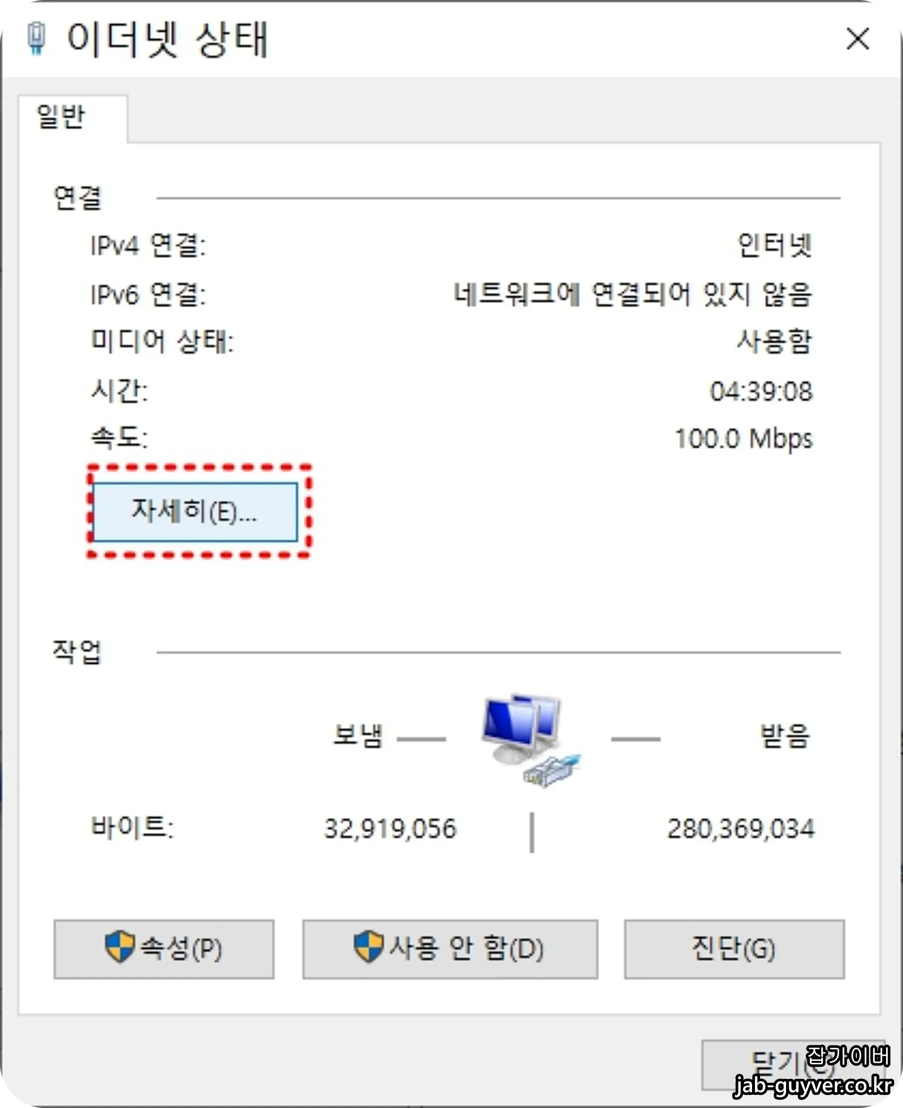 여기서 자세히를 열면 물리적 주소, IPv4/IPv6, 기본 게이트웨이, DHCP/DNS 서버, 임대 시작/만료까지 한 번에 확인됩니다.