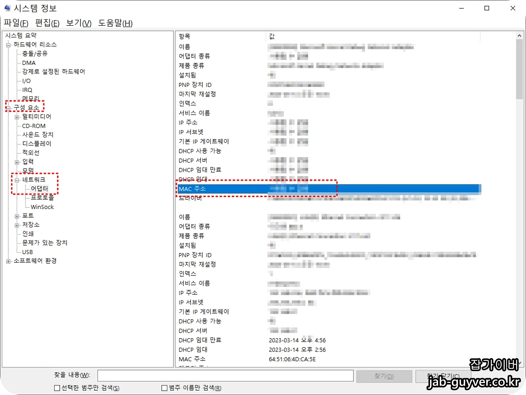 윈도우가 제공하는 시스템정보에서 어댑터별 서비스이름, IP주소, DHCP, MAC주소를 한 번에 볼 수 있습니다.