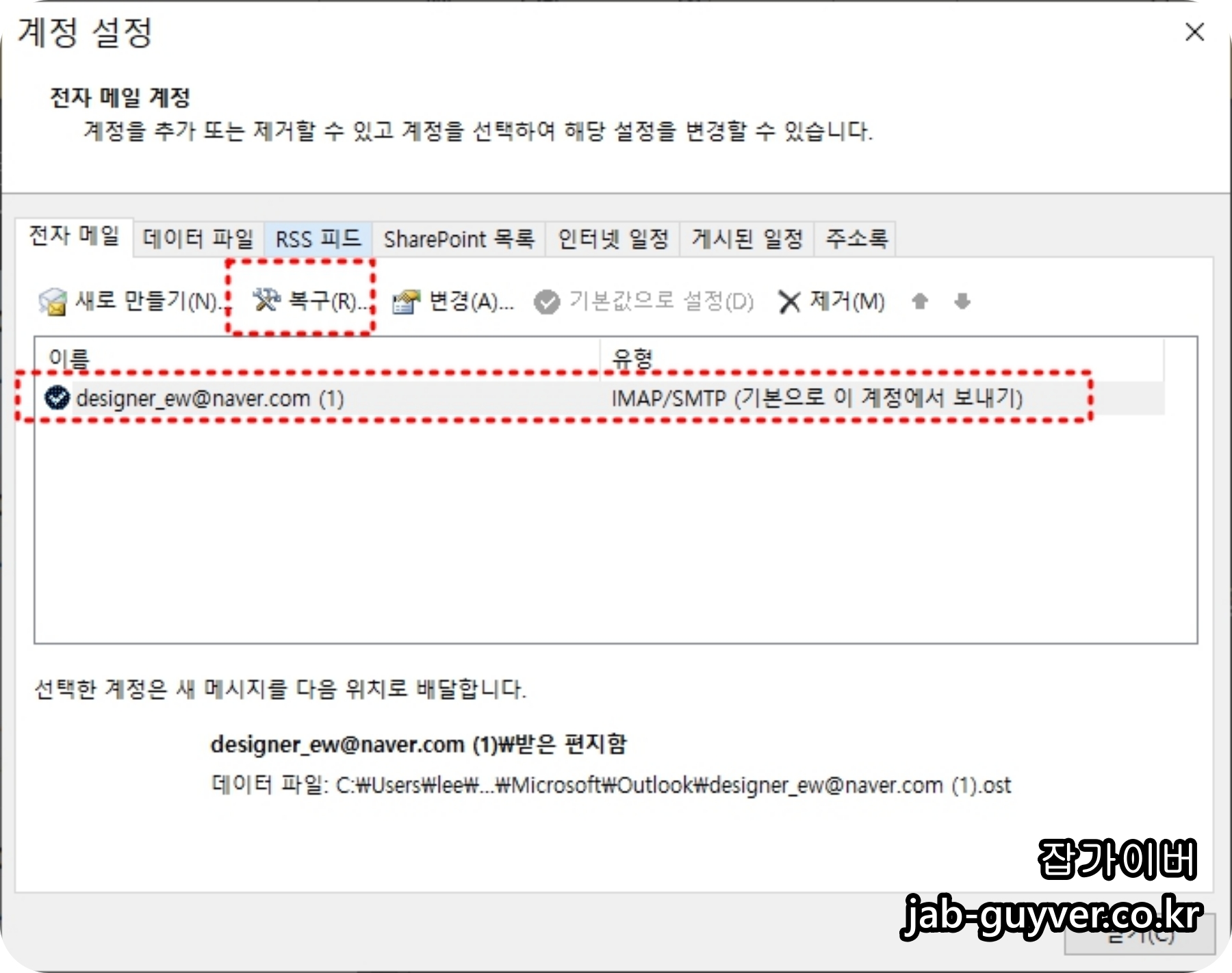 그럼 현재 연동된 메일 중 잘못된 내역이 있는지 찾아 아웃룩 메일 계정복구를 진행합니다.