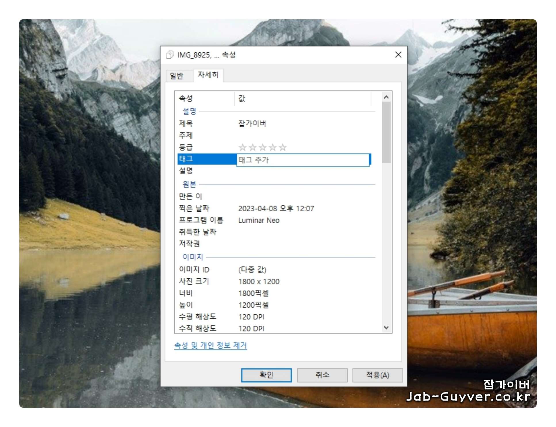 ‘자세히’ 탭으로 이동하면 찍은 날짜, 취득한 날짜, 제목/태그/설명, 해상도, 카메라 정보 등 정리용으로 자주 쓰는 값들이 한 번에 보입니다.