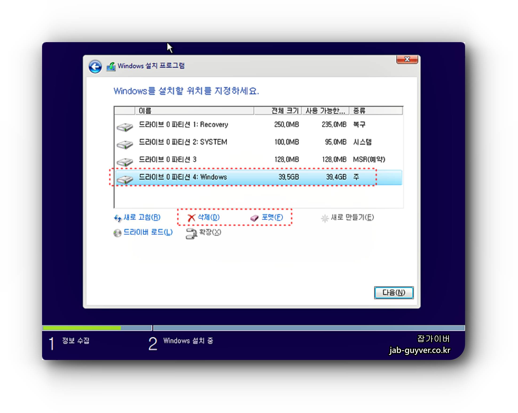 윈도우 설시화면에서 기존에 설치된 윈도우 파티션을 삭제하거나 포맷 후 새롭게 윈도우를 설치합니다.