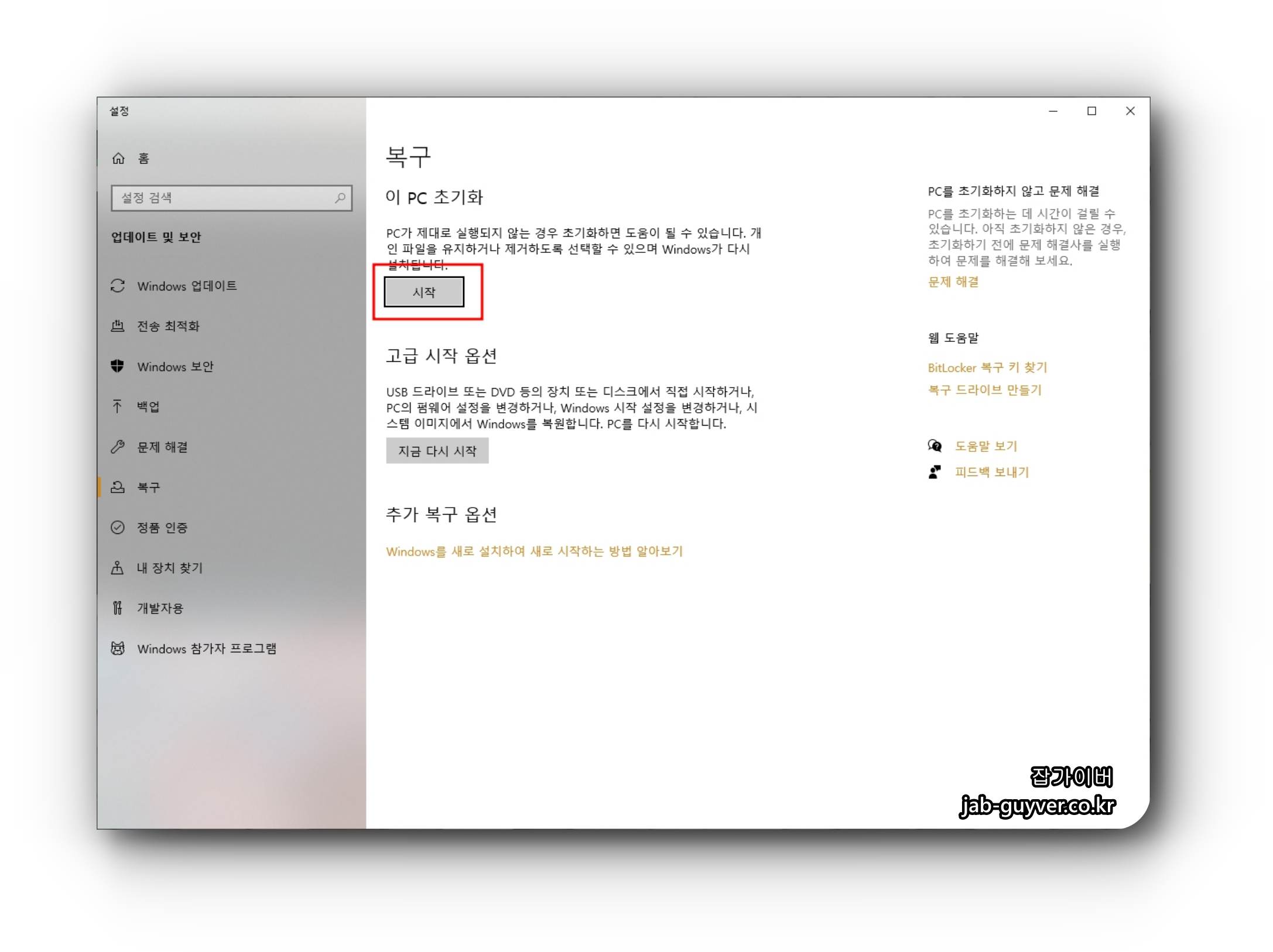 다음 컴퓨터를 다시 시작하고 윈도우 초기화를 진행합니다.