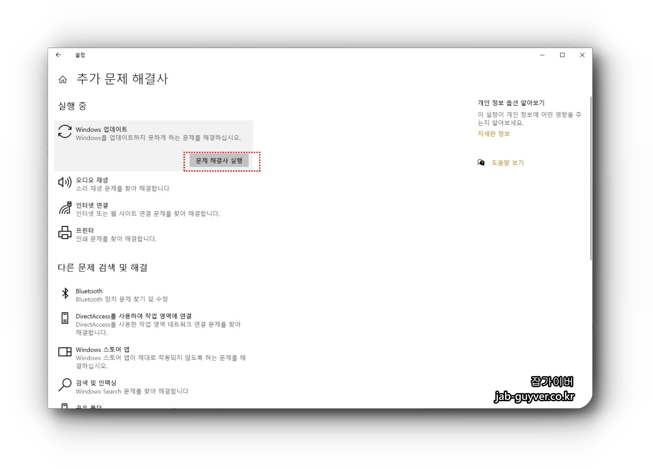 업데이트 및 초기화에 문제가 있다면 문제해결 -> 추가 문제해결사를 선택합니다.