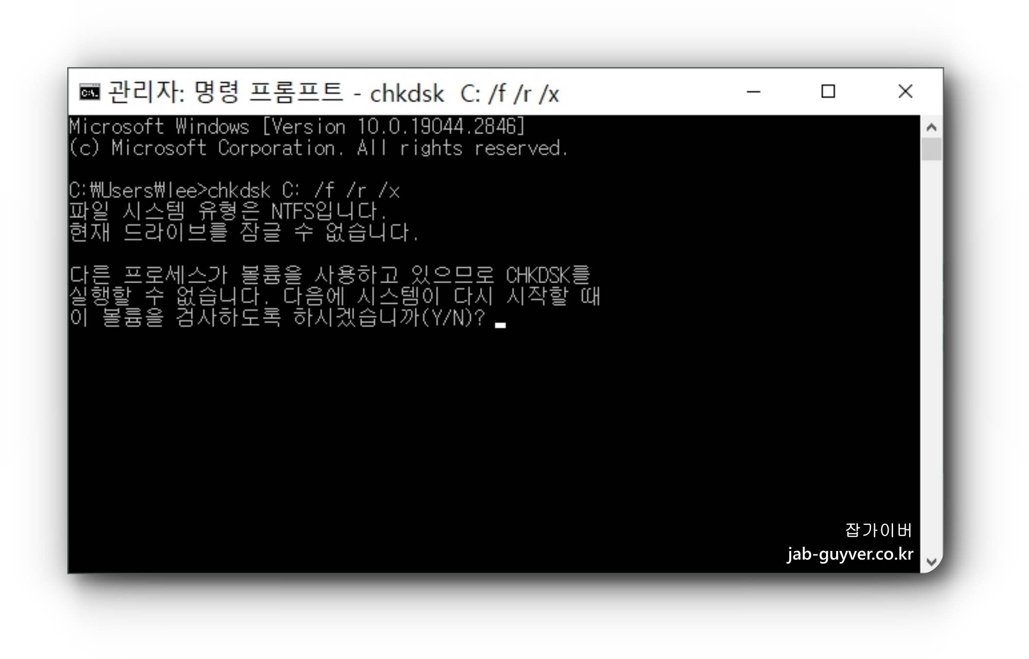 | 위 명령어는 C 드라이브를 대상으로 디스크 검사를 실행하며, 검사 중에 문제가 발견되면 자동으로 복구합니다. |